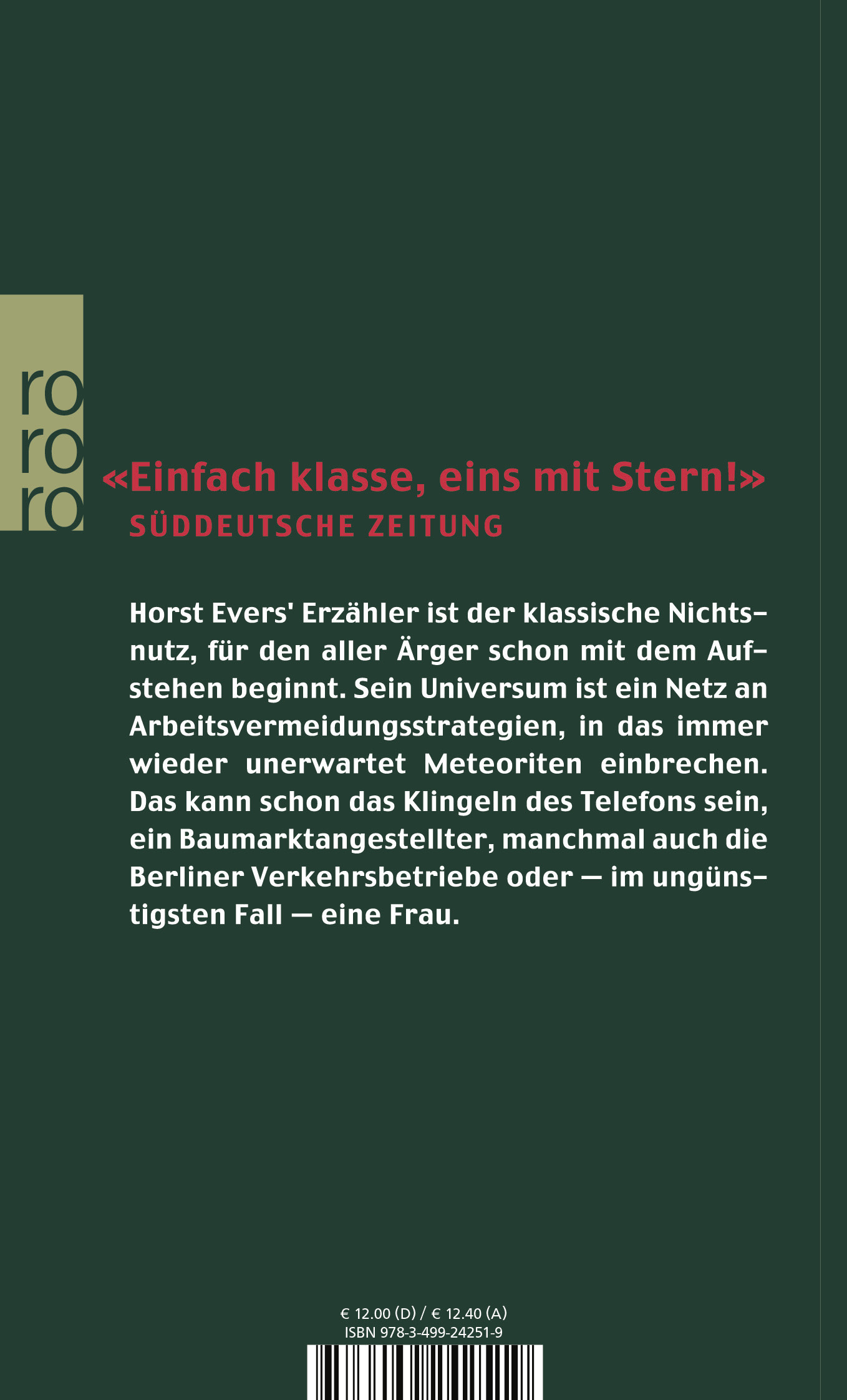 Horst Evers' Erzähler ist der klassische Nichtsnutz, für den aller Ärger schon mit dem Aufstehen beginnt. Sein Universum ist ein Netz an Arbeitsvermeidungsstrategien, in das immer wieder unerwartet Meteoriten einbrechen. Das kann schon das Klingeln des Telefons sein, ein Baumarktangestellter, manchmal auch die Berliner Verkehrsbetriebe oder - im ungünstigsten Fall - eine Frau.