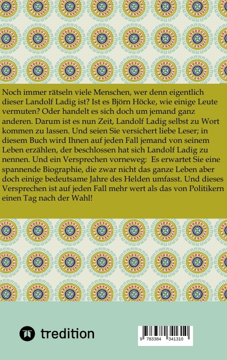 Achtung Satire!!!!!Aufgrund mehrerer Nachfragen von Leuten, die ein Buch offenbar nur nach Einband und Autorenname beurteilen und es noch nicht einmal gelesen haben, teilen wir hiermit mit, dass es sich bei dem Roman mitnichten um rechtsradikale Propaganda oder Ähnliches, sondern um ein satirisches Kunstwerk handelt, welches unter anderem das Phänomen "Landolf Ladig" auf's Korn nimmt. Des Weiteren enthält es eine sehr schöne Geschichte, die Ihnen gewiss gefallen wird.Noch immer rätseln viele Menschen, wer denn eigentlich dieser Landolf Ladig ist? Ist es Björn Höcke, wie einige Leute vermuten? Oder handelt es sich doch um jemand ganz anderen. Darum ist es nun Zeit, Landolf Ladig selbst zu Wort kommen zu lassen. Und seien Sie versichert liebe Leser; in diesem Buch wird Ihnen auf jeden Fall jemand von seinem Leben erzählen, der beschlossen hat sich Landolf Ladig zu nennen. Und ein Versprechen vorneweg: Es erwartet Sie eine spannende Biographie, die zwar nicht das ganze Leben aber doch einige bedeutsame Jahre des Helden umfasst. Und dieses Versprechen ist auf jeden Fall mehr wert als das von Politikern einen Tag nach der Wahl!