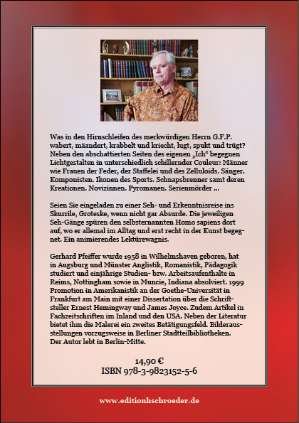 Das Buch ist neu und kann direkt unter www.editionhschroeder.de / Romane und Erzählungen bestellt werden. Über den Inhalt: Was in den Hirnschleifen des merkwürdigen Herrn G.F.P. wabert, mäandert, krabbelt und kriecht, lugt, spukt und trügt? Neben den abschattierten Seiten des eigenen "Ich" begegnen Sie Lichtgestalten in unterschiedlich schillernder Couleur: Männer wie Frauen der Feder, der Staffelei und des Zelluloids. Sänger. Komponisten. Ikonen des Sports. Schnapsbrenner samt deren Kreationen. Novizinnen. Pyromanen. Serienmörder … Seien Sie eingeladen zu einer Seh- und Erkenntnisreise ins Skurrile, Groteske, wenn nicht gar Absurde. Die jeweiligen Seh-Gänge spüren den selbsternannten Homo sapiens dort auf, wo er allemal im Alltag und erst recht in der Kunst begegnet. Ein animierendes Lektürewagnis