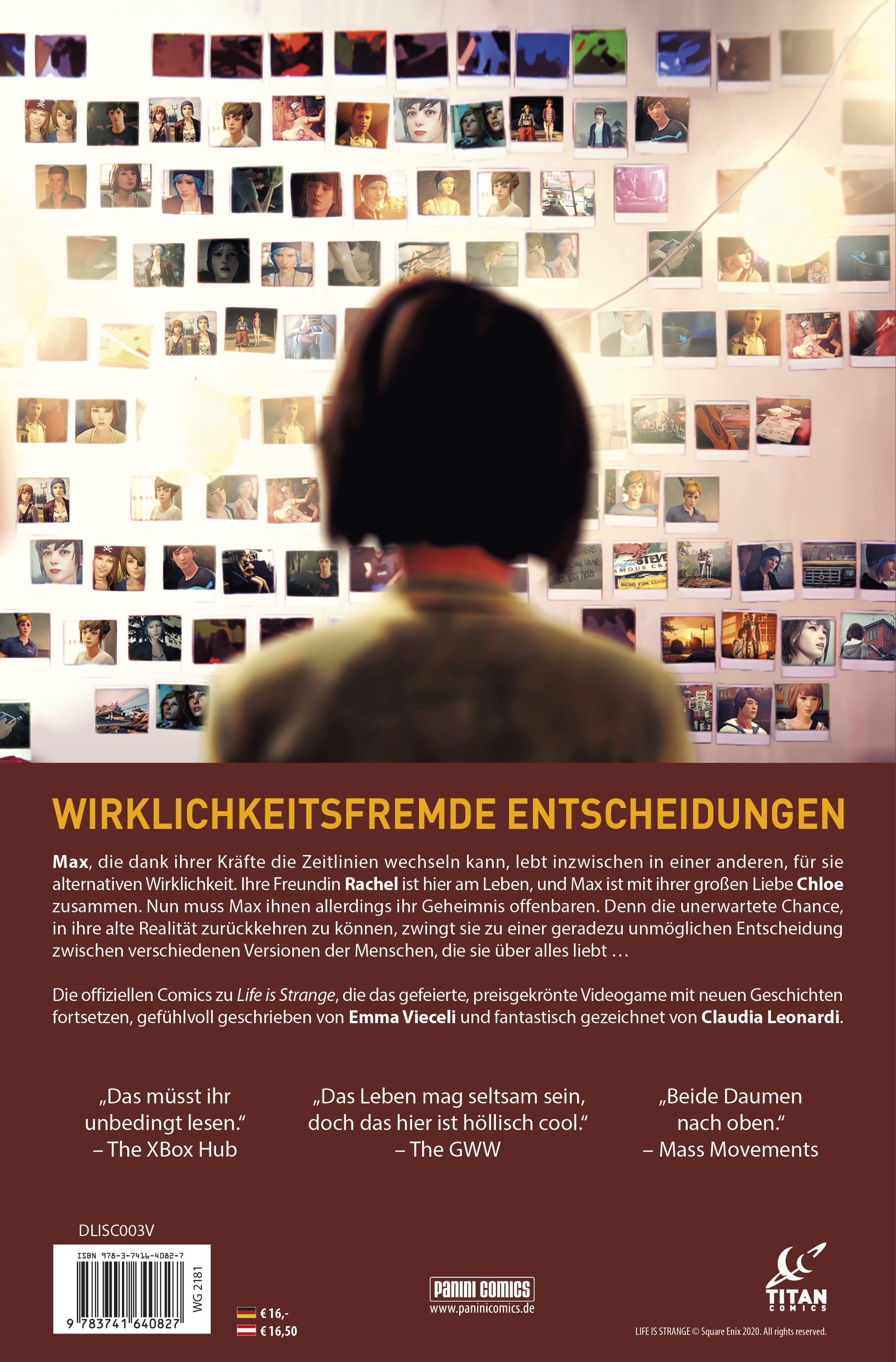 WIRKLICHKEITSFREMDE ENTSCHEIDUNGENMax, die dank ihrer Kräfte die Zeitlinien wechseln kann, lebt inzwischen in einer anderen, für sie alternativen Wirklichkeit. Ihre Freundin Rachel ist hier am Leben, und Max ist mir ihrer großen Liebe Chloe zusammen. Nun muss Max ihnen allerdings ihr Geheimnis offenbaren. Denn die unerwartete Chance, in ihre alte Realität zurückzukehren zu können, zwingt sie zu einer geradezu unmöglichen Entscheidung zwischen verschiedenen Versionen der Menschen, die sie über alles liebt...Die offiziellen Comics zu Life ist Strange, die das gefeierte, preisgekrönte Videogame mit neuen Geschichten fortsetzen, gefühlvoll geschrieben von Emma Vieceli und fantastisch gezeichnet von Claudia Leonardi.