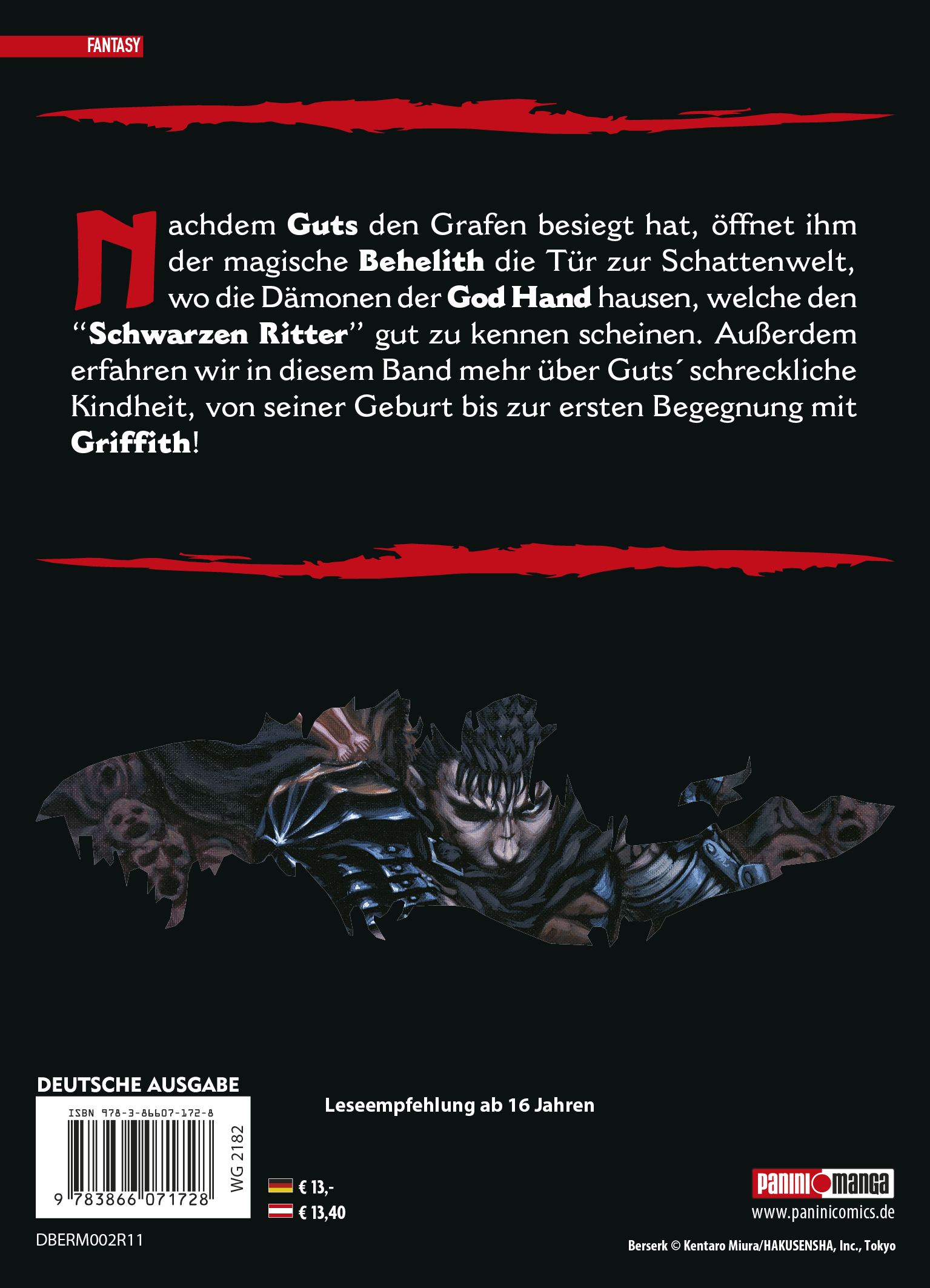 Nachdem Guts den Grafen besiegt hat, öffnet ihm der magische Behelith die Tür zur Schattenwelt, wo die Dämonen der God Hand hausen, welche den"Schwarzen Ritter"gut zu kennen scheinen. Außerdem erfahren wir in diesem Band mehr über Guts schreckliche Kindheit, von seiner Geburt bis zur ersten Begegnung mit Griffith!