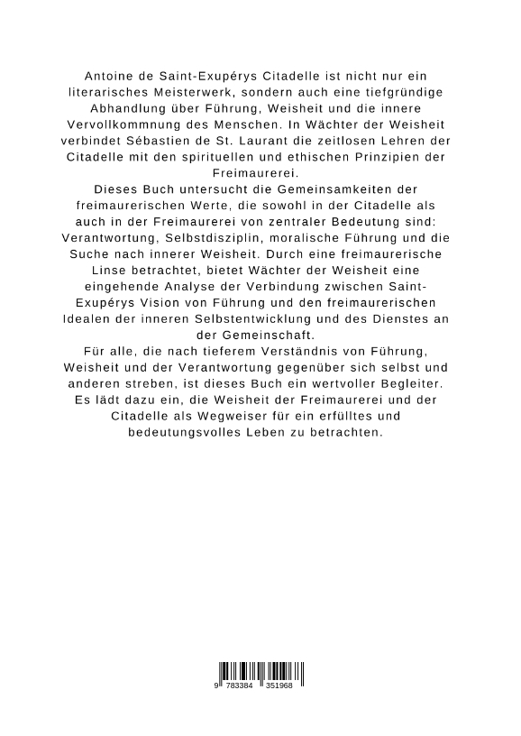 | Schlagworte | Citadelle • Eine Stadt in der Wüste • Ethik • Freimaurer • freimaurerisch • Führung • Leadership • Maurerisch • Persönliche Entwicklung • Saint-Exupéry • Selbstdisziplin |