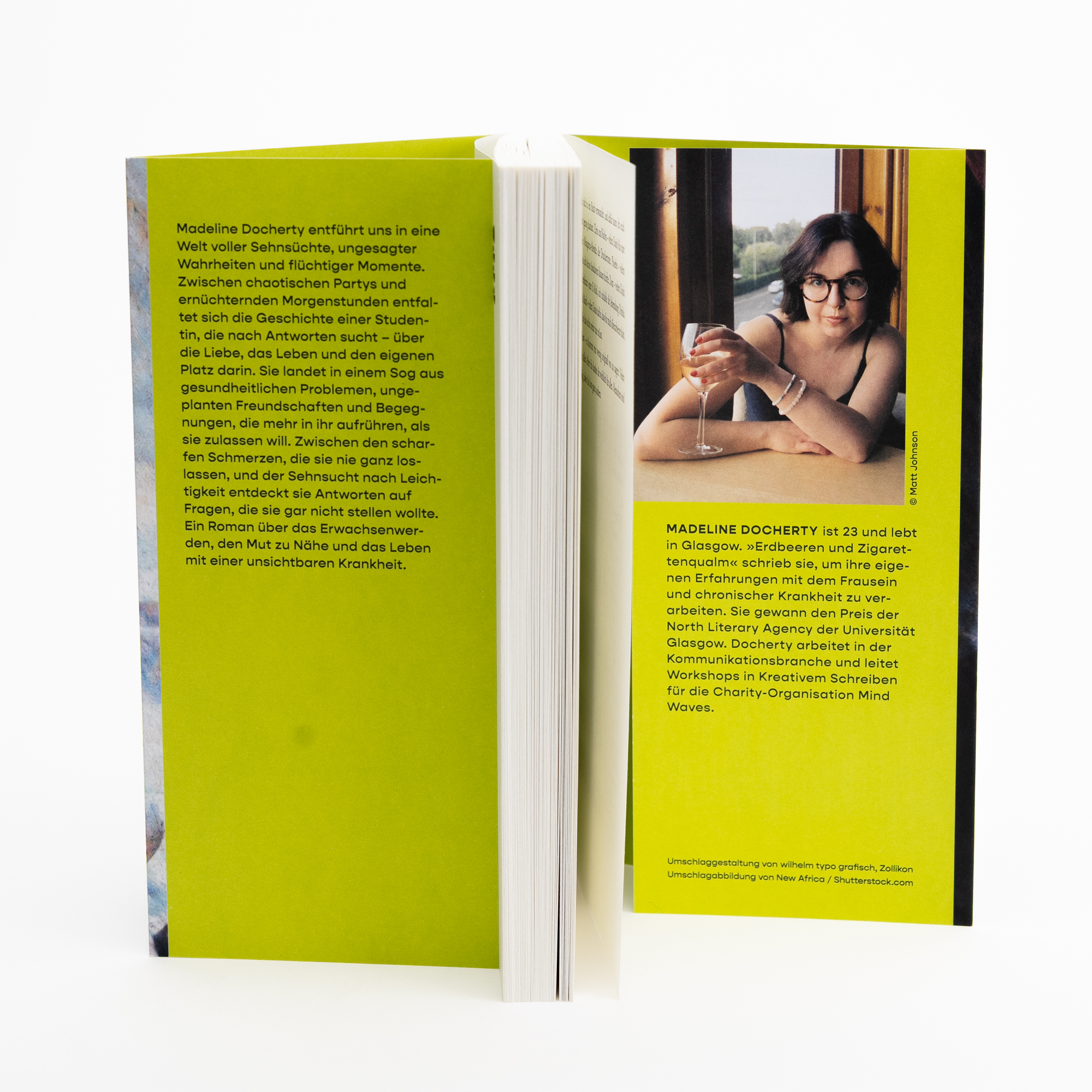 Madeline Docherty ist 23 und lebt in Glasgow. »Erdbeeren und Zigarettenqualm« schrieb sie, um ihre eigenen Erfahrungen mit dem Frausein und chronischer Krankheit zu verarbeiten. Sie gewann den Preis der North Literary Agency der Universität Glasgow. Docherty arbeitet in der Kommunikationsbranche und leitet Workshops in Kreativem Schreiben für die Charity-Organisation Mind Waves.