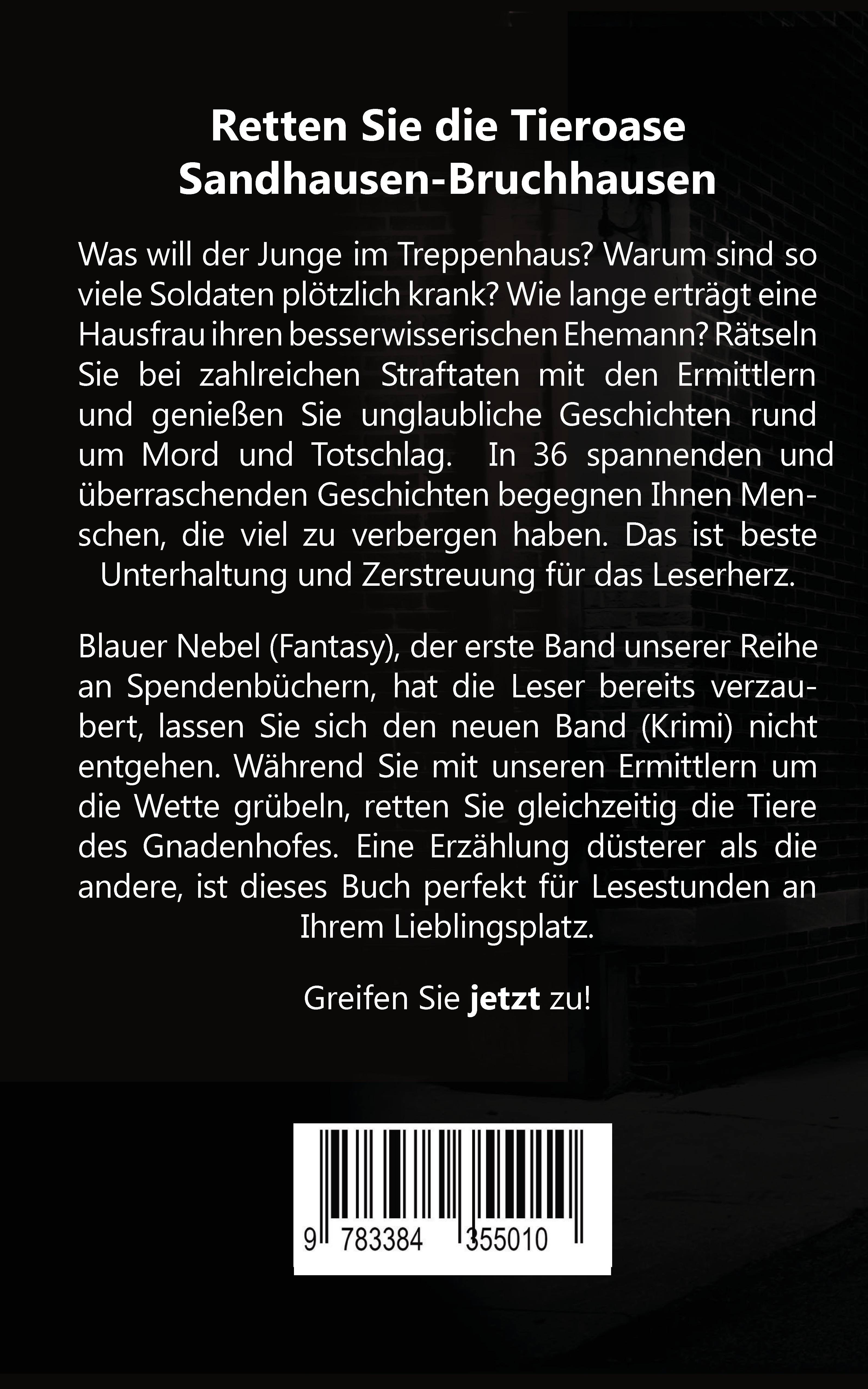 Retten Sie die Tieroase Sandhausen-BruchhausenWas will der Junge im Treppenhaus? Warum sind so viele Soldaten plötzlich krank? Wie lange erträgt eine Hausfrau ihren besserwisserischen Ehemann? Rätseln Sie bei zahlreichen Straftaten mit den Ermittlern und genießen Sie unglaubliche Geschichten rund um Mord und Totschlag. In 36 spannenden und überraschenden Geschichten begegnen Ihnen Menschen, die viel zu verbergen haben. Das ist beste Unterhaltung und Zerstreuung für das Leserherz.Blauer Nebel (Fantasy), der erste Band unserer Reihe an Spendenbüchern, hat die Leser bereits verzaubert, lassen Sie sich den neuen Band (Krimi) nicht entgehen. Während Sie mit unseren Ermittlern um die Wette grübeln, retten Sie gleichzeitig die Tiere des Gnadenhofes. Eine Erzählung düsterer als die andere, ist dieses Buch perfekt für Lesestunden an Ihrem Lieblingsplatz.Greifen Sie jetzt zu!Enthalten sind folgende Geschichten:Der Junge im Treppenhaus von Andreas GruberTodesnah von Chris KarldenKzH von Steffen SchulzeBriefgeheimnis von Steffen SchulzeGucci, Chanel - Begemann von Christiane LandgrafDer Besucher von Heike MeckelmannDer rote Ballon von Heike MeckelmannJa, Schatz ... von Heike MeckelmannMörderische Weihnachten von Heike MeckelmannSüße Versuchung von Heike MeckelmannVon Aus- und Umwegen von Alex RollerFataler Fehler von Astrid PlötnerDer Geist von Marwood House von Ina LingerAsana des Todes von Marie BastideHaltet den Dieb von Marie BastideDie pure Lust von Marie BastideWie viel ist das Leben wert von Noah FitzAuf der Flucht von Patrick WoywodDas Attentat von Beatrice BraunLange dunkle Winternächte von Marsali Taylor (übersetzt von Jürgen Hammerich)Die Stille der See von Marsali Taylor (übersetzt von Jürgen Hammerich)Was da kreucht und fleucht von Marsali Taylor (übersetzt von Jürgen Hammerich)Der Fußball von Carola ChristiansenDüstere Absichten von Ana DeeVollmondmord von Isa KlinkDie Gottesanbeterin von Sybille BaeckerBrennende Eifersucht von Viola EigenbrodtEin Schritt in die Ewigkeit von Ingrid SchmitzHinterhältige Spielchen von Astrid MiglarDie Hand von Edith PolkehnDie Glückssträhne von Edith PolkehnTilly See von Tanja WenzSherlock Holmes - Fünfmal Zucker bitte von Leo BüchnerZwischen Schutt und Asche von Thomas HerzbergDer Fall Baby Charly von Maike JohnkeZorniges Herz von Katharina Gerlach