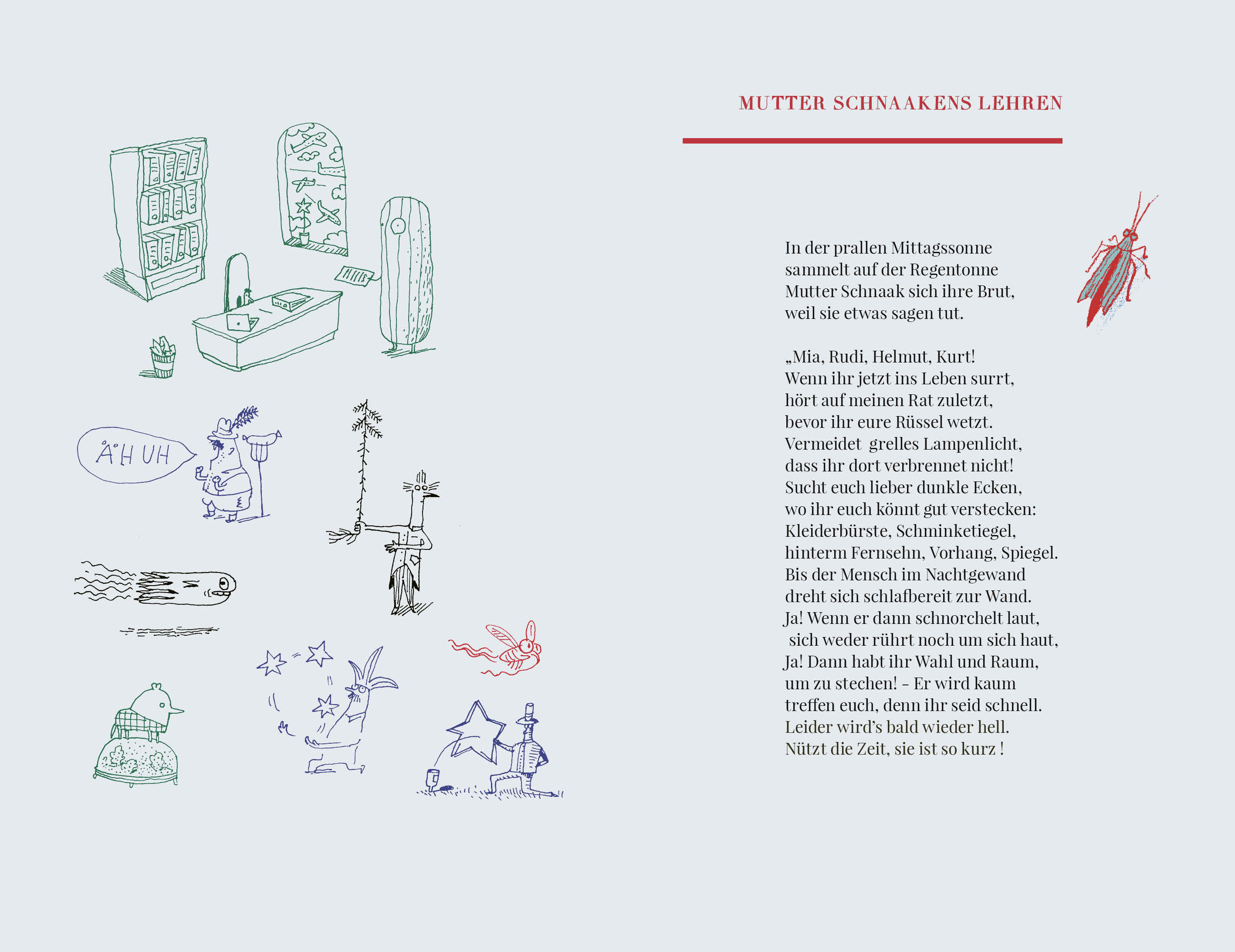 Wenn ein Kalkül auf ein Molekül trifft, wenn Motten ihre goldene Hochzeit im Pelzladen feiern oder eine Mücke ihren Kindern beibringt, wie man möglichst effektiv Blut saugt, dann führt uns Autor Siegfried C. Arnold in seinem dritten Band witziger Gedichte vor, wie herrlich sonderbar die Welt sein kann. Sein Blick gilt kleinen Tieren, zänkischen Nachbarn, Steinen auf Reisen und einer einsamen Straßenlaterne, die sich einen Freund wünscht. Oder wenigstens etwas Anerkennung für ihre Arbeit. Es sind dreissig Gedichte, vier Lieder und eine Geschichte, die glücklich machen. Mit viel Witz, mit Seele, mit unbändiger Fabulierlust führt uns Arnold einmal mehr Situationen und Figuren vor, die uns Lachen, Schmunzeln und Mitfühlen lassen. Nicht unerwähnt bleiben sollte die Hohe Katzendichte in diesen Texten. Und wer würde nicht mit dem Schwarm Motten um die Laterne taumeln wollen, wenn es so herrlich lebenssatt fantasiert wird: "Ein letztes Mal will ich mit Dir ums Licht! Will tanzen / müsst fliehen! / Sonst werd ich verglühen ...! / Zu spät! Es zischt! / Zu retten gabs nischt".