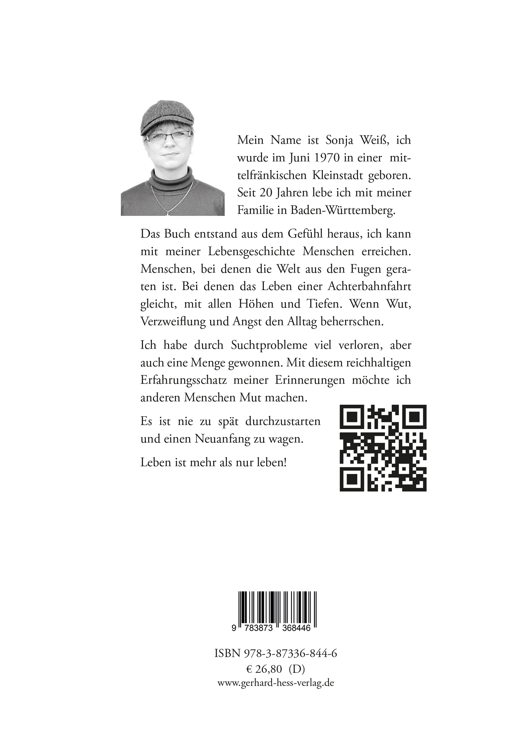 Mein Name ist Sonja Weiß, ich wurde im Juni 1970 in einer mittelfränkischen Kleinstadt geboren. Seit 20 Jahren lebe ich mit meiner Familie in Baden-Württemberg. Das Buch entstand aus dem Gefühl heraus, ich kann mit meiner Lebensgeschichte Menschen erreichen. Menschen, bei denen die Welt aus den Fugen geraten ist. Bei denen das Leben einer Achterbahnfahrt gleicht, mit allen Höhen und Tiefen. Wenn Wut, Verzweiflung und Angst den Alltag beherrschen. Ich habe durch Suchtprobleme viel verloren, aber auch eine Menge gewonnen. Mit diesem reichhaltigen Erfahrungsschatz meiner Erinnerungen möchte ich anderen Menschen Mut machen. Es ist nie zu spät durchzustarten und einen Neuanfang zu wagen. Leben ist mehr als nur leben!