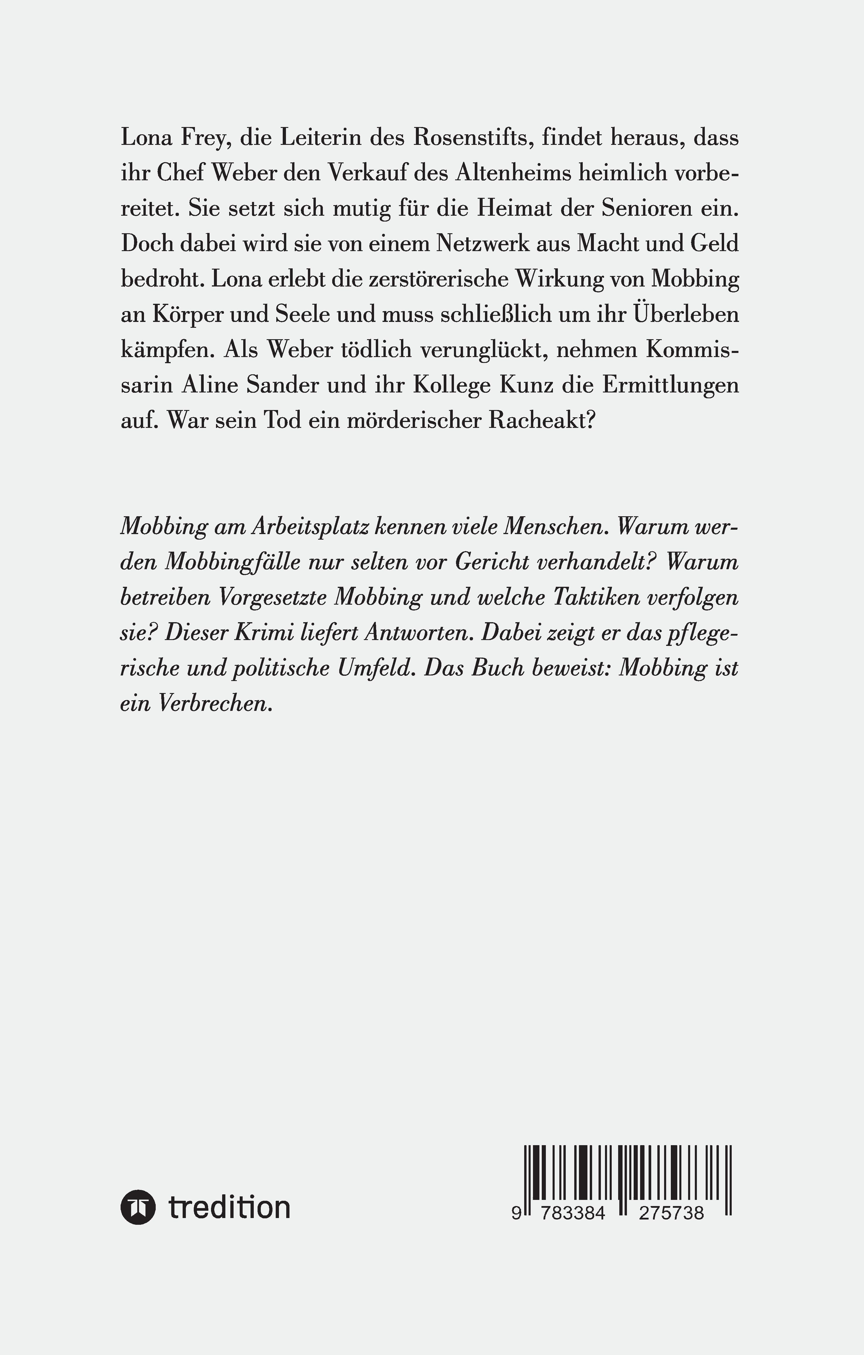Ein Psycho-Krimi aus dem Seniorenheim. Lona Frey, die Leiterin des Rosenstifts, nimmt ihre Verantwortung ernst. Sie kämpft gegen den Verkauf des Seniorenheims, der von ihrem Vorgesetzter Weber illegal vorbereitet wird. Doch dabei wird sie von einem Netzwerk aus Macht und Geld bedroht. Sie erlebt die zerstörerische Wirkung von Mobbing und muss schließlich um ihr Leben fürchten. Der Konflikt wird zum Psychothriller. Doch sie gibt nicht auf. Sie setzt sich klug gegen die Angriffe ihres Chefs und seiner Verbündeten zur Wehr und stützt sich auf die Mitarbeitenden und die Bewohner. Webers Mobbingmaßnahmen ziehen immer größere Kreise und belasten immer mehr Menschen im Rosenstift und dem Umfeld. Das Buch zeigt politische Abhängigkeiten und Verstrickungen in einer Kommune. Weber stirbt bei einem rätselhaften Verkehrsunfall, und Kommissarin Aline Sander und ihr Kollege Kunz nehmen die Ermittlungen auf. War sein Tod ein mörderischer Racheakt? Der Roman spielt in der schönen Kurstadt Baden-Baden und ihrer malerischen Umgebung. Er handelt auch von Liebe und Freundschaft, von Tieren und Reisen. Mobbing am Arbeitsplatz kennen viele. Warum werden Mobbingfälle nur selten vor Gericht verhandelt? Dieses Buch zeigt das pflegerische, politische und rechtliche Umfeld in einer spannenden Krimihandlung.