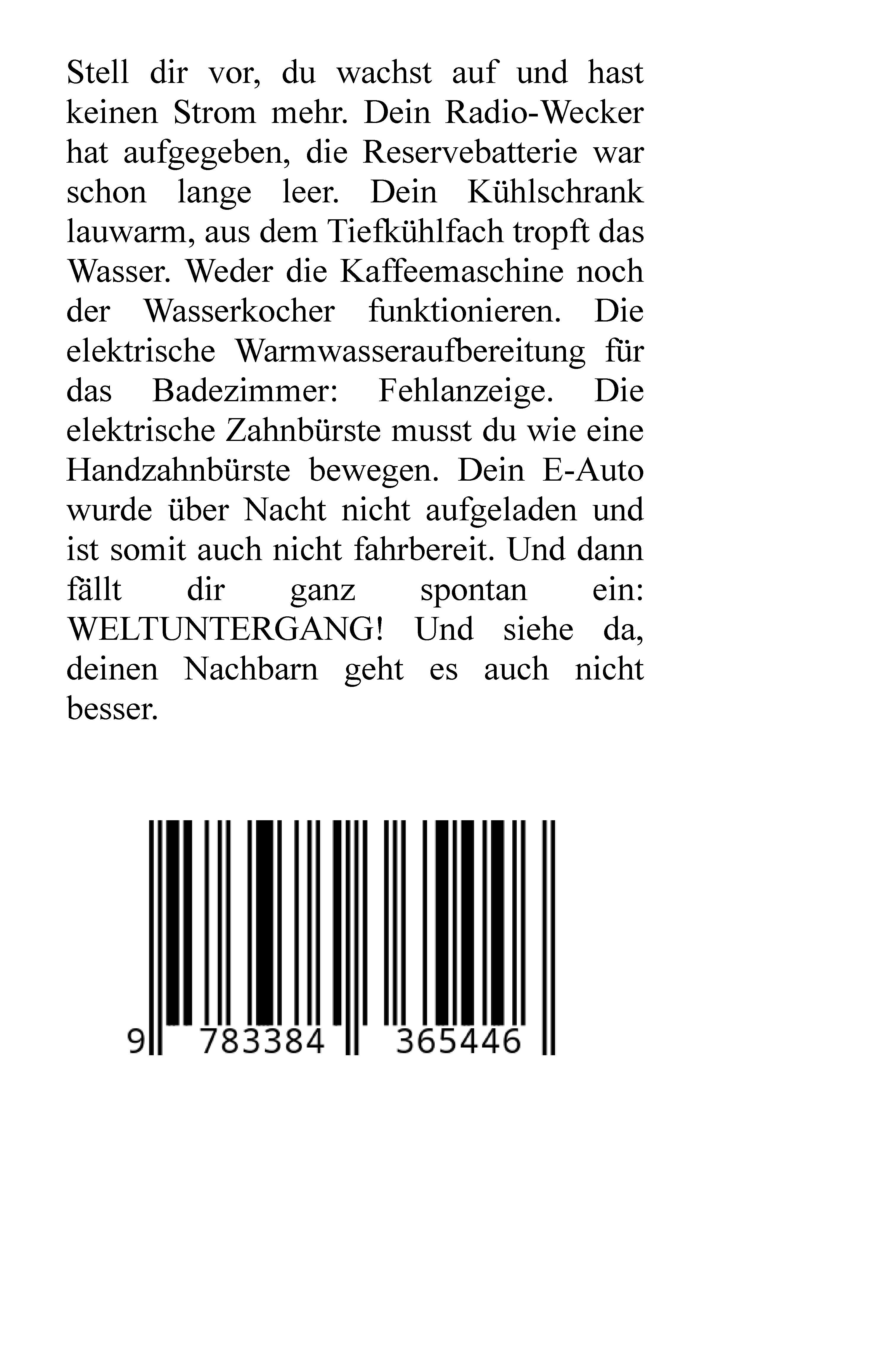| Schlagworte | Analoge Fähigkeiten • ausgefallene Tiefkühltruhen • Autismus • Bergbauernhof • E-Auto • E-Bikes • Hackerangriff • keine Kühltruhen, keine Kühlschränke • keine Möglichkeit Essen zu kochen, Wäsche zu waschen • kein Internet, kein Handy, kein Radio oder Fernsehen • Klimakatastrophe • Küstenregionen "Land unter" • Mauer im Mittelmeer • Mauer um Europa • Meteoriteneinschlag • ÖPNV • Permakultur • versunkene Küsten • Versunkene Städte • Weltkriege • Weltweite Flutwelle • weltweiter Stromausfall • Weltweiter Tsunami |