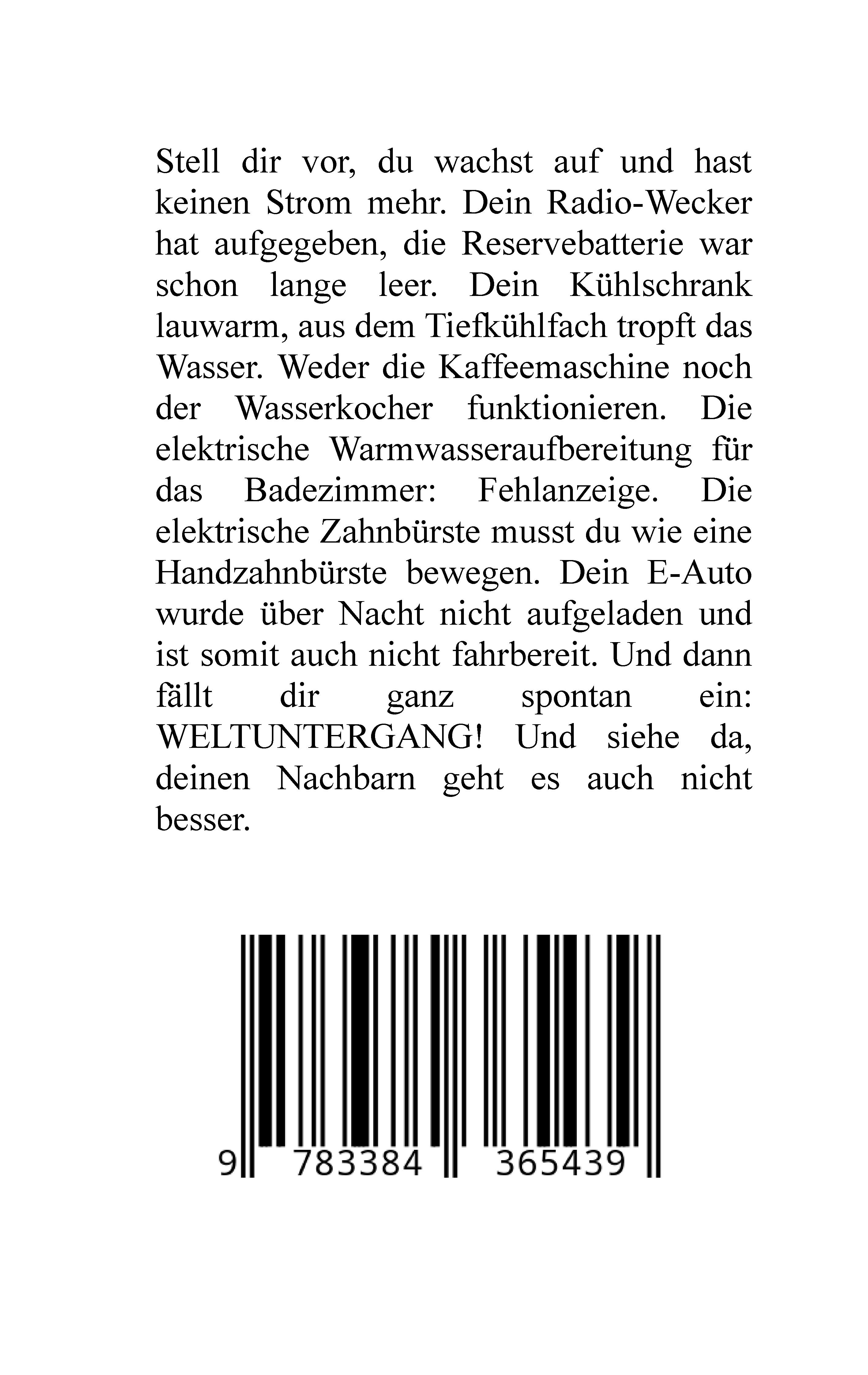 | Schlagworte | Analoge Fähigkeiten • ausgefallene Tiefkühltruhen • Autismus • Bergbauernhof • E-Auto • E-Bikes • Hackerangriff • keine Kühltruhen, keine Kühlschränke • keine Möglichkeit Essen zu kochen, Wäsche zu waschen • kein Internet, kein Handy, kein Radio oder Fernsehen • Klimakatastrophe • Küstenregionen "Land unter" • Mauer im Mittelmeer • Mauer um Europa • Meteoriteneinschlag • ÖPNV • Permakultur • versunkene Küsten • Versunkene Städte • Weltkriege • Weltweite Flutwelle • weltweiter Stromausfall • Weltweiter Tsunami |