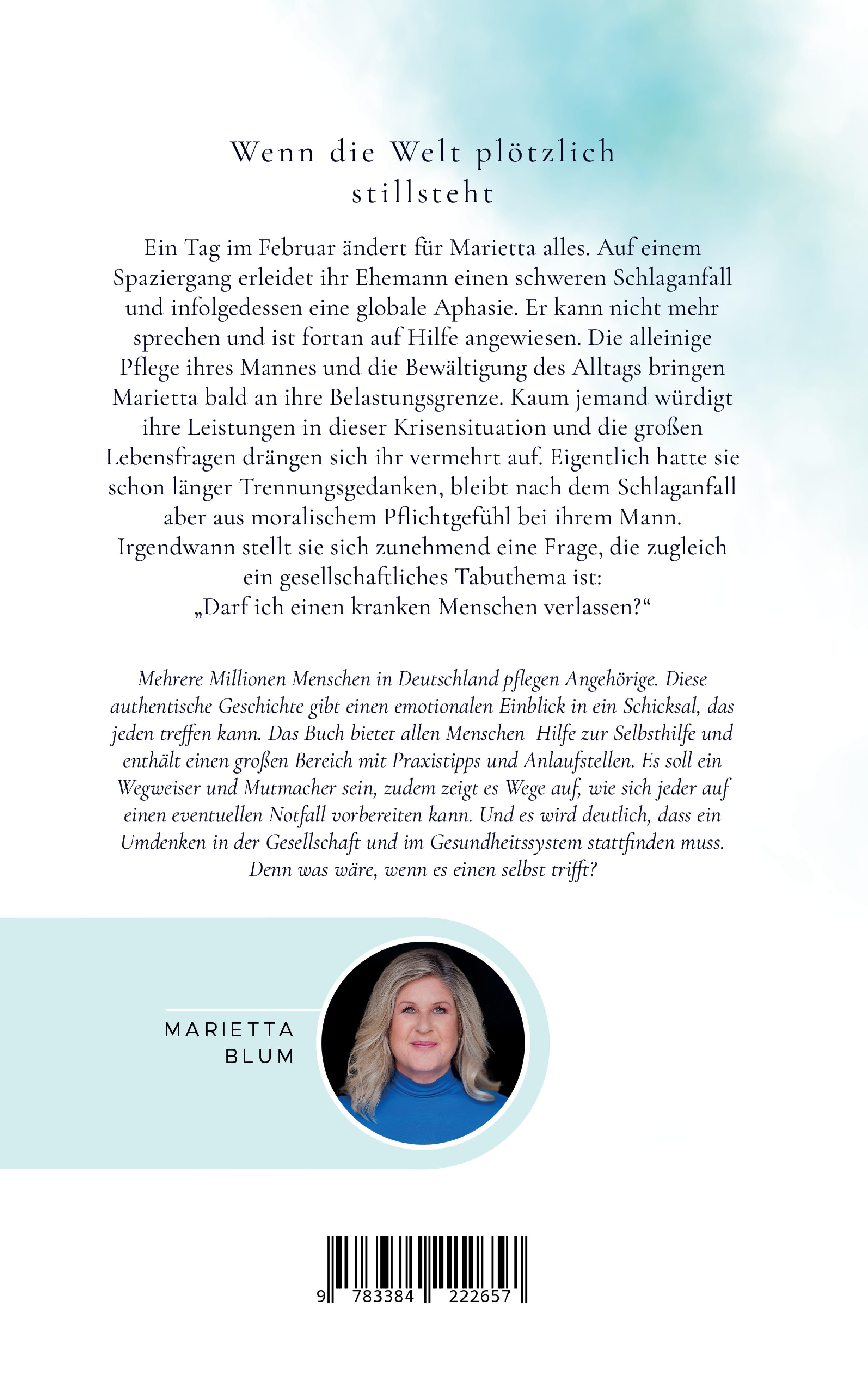 Wenn die Welt plötzlich stillsteht: Ein Tag im Februar ändert für Marietta alles. Auf einem Spaziergang erleidet ihr Ehemann einen schweren Schlaganfall und infolgedessen eine globale Aphasie. Er kann nicht mehr sprechen und ist fortan auf Hilfe angewiesen. Die alleinige Pflege ihres Mannes und die Bewältigung des Alltags bringen Marietta bald an ihre Belastungsgrenze. Kaum jemand würdigt ihre Leistungen in dieser Krisensituation und die großen Lebensfragen drängen sich ihr vermehrt auf. Eigentlich hatte sie schon länger Trennungsgedanken, bleibt nach dem Schlaganfall aber aus moralischem Pflichtgefühl bei ihrem Mann. Irgendwann stellt sie sich zunehmend eine Frage, die zugleich ein gesellschaftliches Tabuthema ist: "Darf ich einen kranken Menschen verlassen?"Mehrere Millionen Menschen in Deutschland pflegen Angehörige. Diese authentische Geschichte gibt einen emotionalen Einblick in ein Schicksal, das jeden treffen kann. Das Buch bietet allen Menschen Hilfe zur Selbsthilfe und enthält einen großen Bereich mit Praxistipps und Anlaufstellen. Es soll ein Wegweiser und Mutmacher sein, zudem zeigt es Wege auf, wie sich jeder auf einen eventuellen Notfall vorbereiten kann. Und es wird deutlich, dass ein Umdenken in der Gesellschaft und im Gesundheitssystem stattfinden muss. Denn was wäre, wenn es einen selbst trifft?