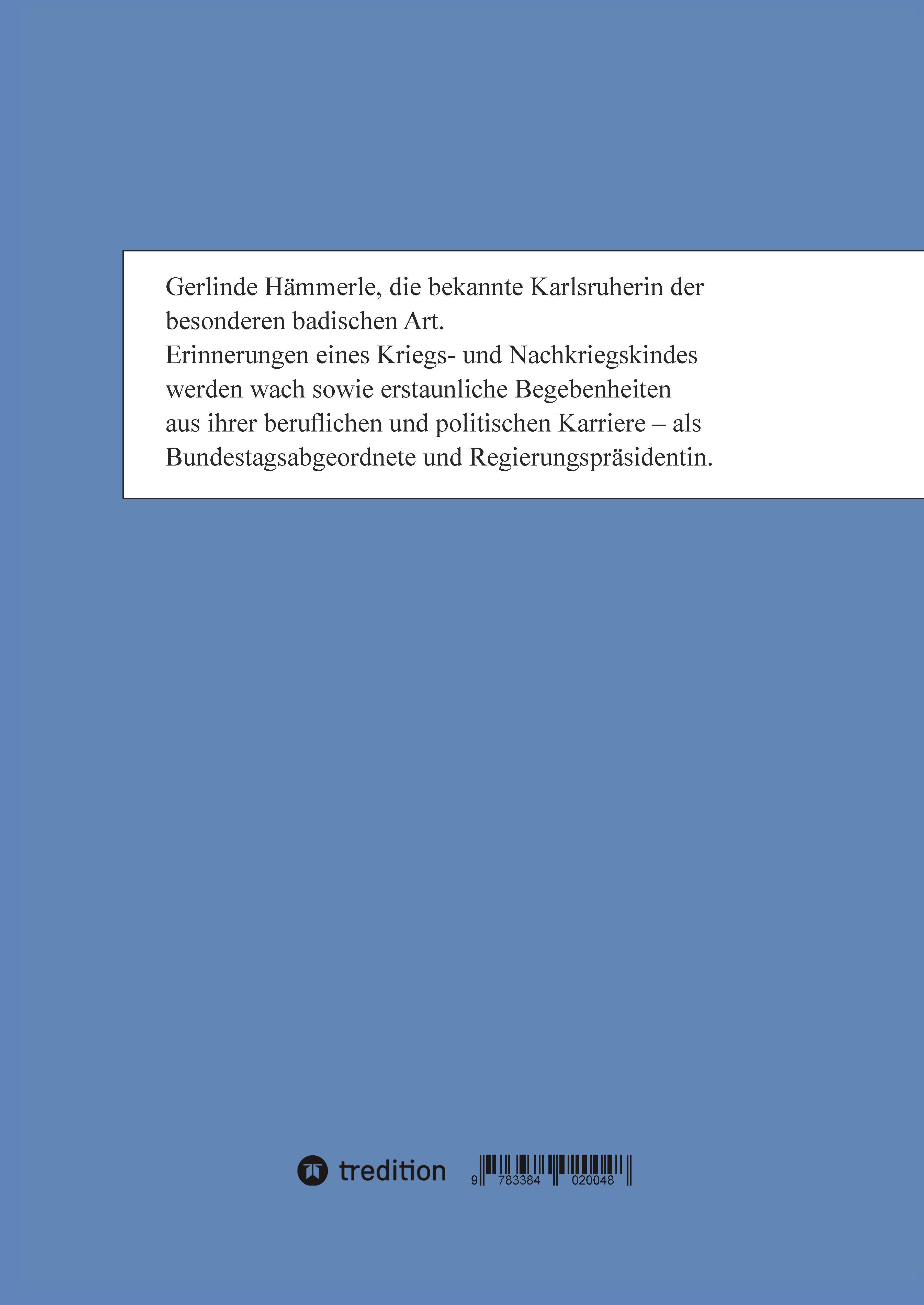 Gerlinde Hämmerle, eine stadtbekannte Karlsruherin der besonderen badischen Art.Sie schreibt wie sie spricht, bildhaft, humorvoll und sehr menschlich.Erinnerungen eines Kriegs- und Nachkriegskindes werden wach sowie erstaunliche Erlebnisse aus ihrer beruflichen und politischen Karriere. Kriegskinder hatten in ihrem frühen Leben eine ganz besondere Herausforderung. Das dies bis ins hohe Alter seine Auswirkungen hat, kann Gerlinde Hämmerle mit diesen Aufzeichnungen besonders der jungen Generation nahebringen. Als junge Lehrerin, Schulleiterin, Karlsruher Stadträtin, Politikerin im Bundestag sowie als hohe Verwaltungsbeamtin, Karlsruher Regierungspräsidentin und auch jetzt im Alter hat sie immer Stellung bezogen zu gesellschaftspolitischen Fragen. Besonders am Herzen liegt ihr die Geschichte der Demokratiebewegung und deren Umsetzung.
