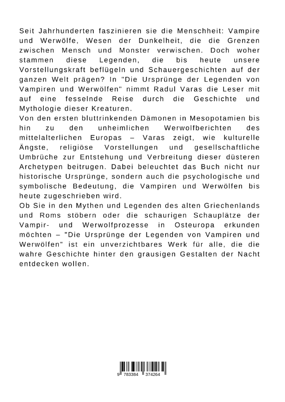 Seit Jahrhunderten faszinieren sie die Menschheit: Vampire und Werwölfe, Wesen der Dunkelheit, die die Grenzen zwischen Mensch und Monster verwischen. Doch woher stammen diese Legenden, die bis heute unsere Vorstellungskraft beflügeln und Schauergeschichten auf der ganzen Welt prägen? In "Die Ursprünge der Legenden von Vampiren und Werwölfen" nimmt Radul Varas die Leser mit auf eine fesselnde Reise durch die Geschichte und Mythologie dieser Kreaturen.Von den ersten bluttrinkenden Dämonen in Mesopotamien bis hin zu den unheimlichen Werwolfberichten des mittelalterlichen Europas - Varas zeigt, wie kulturelle Ängste, religiöse Vorstellungen und gesellschaftliche Umbrüche zur Entstehung und Verbreitung dieser düsteren Archetypen beitrugen. Dabei beleuchtet das Buch nicht nur historische Ursprünge, sondern auch die psychologische und symbolische Bedeutung, die Vampiren und Werwölfen bis heute zugeschrieben wird.Ob Sie in den Mythen und Legenden des alten Griechenlands und Roms stöbern oder die schaurigen Schauplätze der Vampir- und Werwolfprozesse in Osteuropa erkunden möchten - "Die Ursprünge der Legenden von Vampiren und Werwölfen" ist ein unverzichtbares Werk für alle, die die wahre Geschichte hinter den grausigen Gestalten der Nacht entdecken wollen.