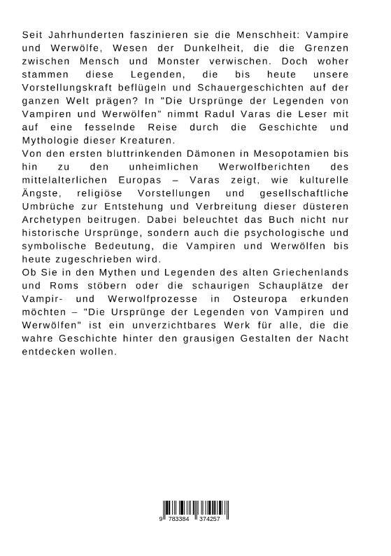 Seit Jahrhunderten faszinieren sie die Menschheit: Vampire und Werwölfe, Wesen der Dunkelheit, die die Grenzen zwischen Mensch und Monster verwischen. Doch woher stammen diese Legenden, die bis heute unsere Vorstellungskraft beflügeln und Schauergeschichten auf der ganzen Welt prägen? In "Die Ursprünge der Legenden von Vampiren und Werwölfen" nimmt Radul Varas die Leser mit auf eine fesselnde Reise durch die Geschichte und Mythologie dieser Kreaturen.Von den ersten bluttrinkenden Dämonen in Mesopotamien bis hin zu den unheimlichen Werwolfberichten des mittelalterlichen Europas - Varas zeigt, wie kulturelle Ängste, religiöse Vorstellungen und gesellschaftliche Umbrüche zur Entstehung und Verbreitung dieser düsteren Archetypen beitrugen. Dabei beleuchtet das Buch nicht nur historische Ursprünge, sondern auch die psychologische und symbolische Bedeutung, die Vampiren und Werwölfen bis heute zugeschrieben wird.Ob Sie in den Mythen und Legenden des alten Griechenlands und Roms stöbern oder die schaurigen Schauplätze der Vampir- und Werwolfprozesse in Osteuropa erkunden möchten - "Die Ursprünge der Legenden von Vampiren und Werwölfen" ist ein unverzichtbares Werk für alle, die die wahre Geschichte hinter den grausigen Gestalten der Nacht entdecken wollen.