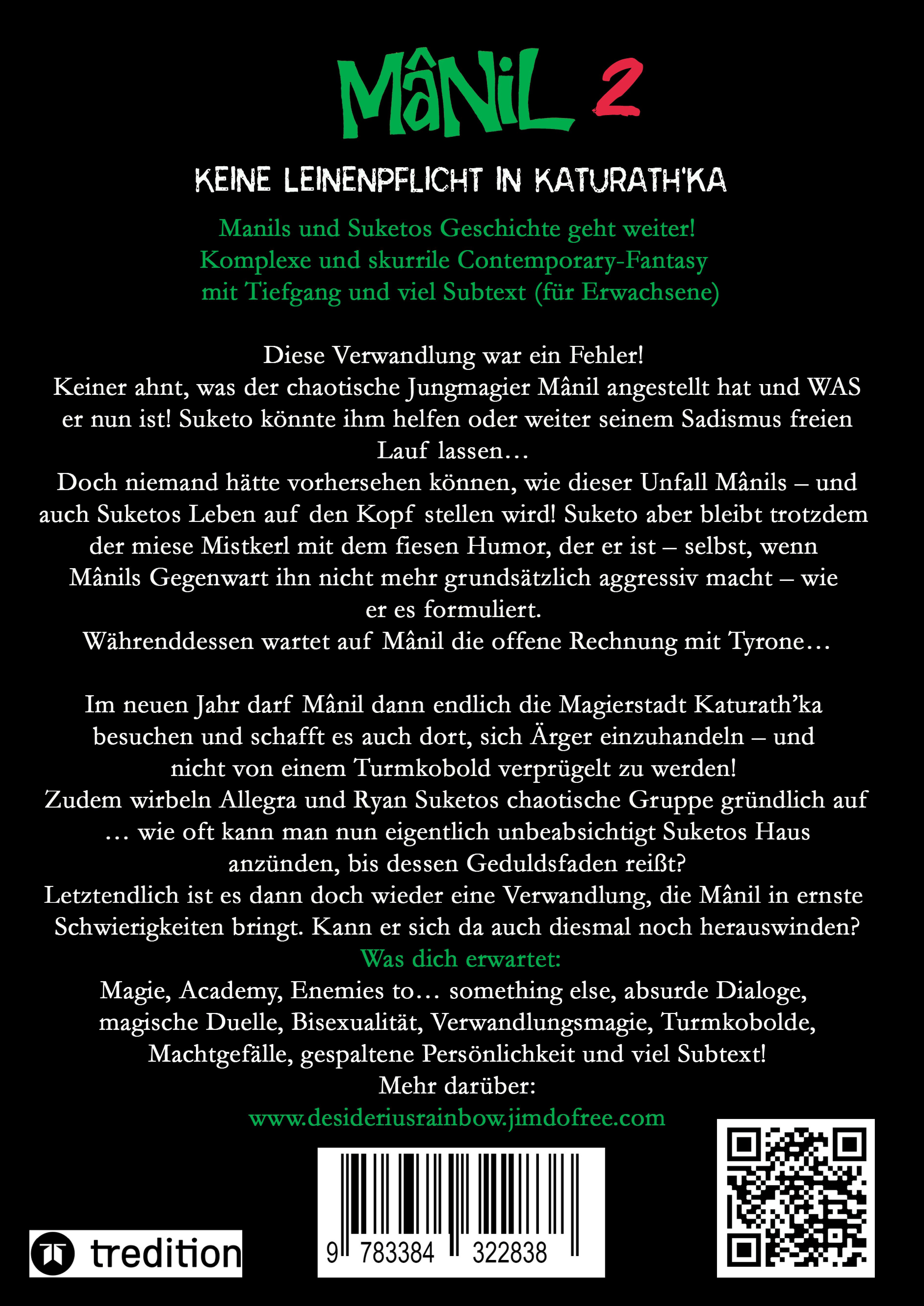 Mein Name ist Desiderius M. Rainbow, ich bestehe zur Hälfte aus Tinte und Papier und ich habe mein Herz schon vor langer Zeit an die Contemporary-Fantasy verloren. Ich schreibe ausschließlich das, was ich auch selbst gern lesen wollen würde, und kümmere mich, wie in jedem Bereich meines Lebens, nicht darum, was andere erwarten. Bei mir gibt es absurde Dialoge, Wortspielereien, Situationskomik und schrullige Protagonisten, gemixt mit überraschender Tiefgründigkeit und ernsten Themen. Mir gefällt der Kontrast zwischen Happyplace und Psychochaos, ich liebe Subtext und das Thema Machtgefälle. Außerdem lege ich ebenso viel Wert auf die persönliche Entwicklung der Charaktere wie auf die eigentliche Handlung. Wenn ich nicht gerade schreibe, bin ich Tänzer mit Tanzstudio und eigener Show aus Flensburg. Zeitgenössische Fantasy Geschichten habe ich jedoch schon geschrieben, ehe ich auch nur übers tanzen nachgedacht habe. Ich bin trans und das Schreiben war für mich lange Zeit der einzige Ort, an dem ich der sein konnte, der ich wirklich bin. Besonders habe ich mich mit den beiden Hauptcharakteren dieser Buchreihe identifiziert, weshalb ich 2020 bei meiner Vornamens- und Personenstandsänderung Mânil als meinen neuen Rufnamen habe eintragen lassen (Wobei Mânil im Buch zwar queer, aber nicht trans ist). Um Verwirrung zu vermeiden, lasse ich mich in der Öffentlichkeit trotzdem lieber Desiderius nennen – die Grenzen zwischen mir und der Geschichte sind ohnehin schon sehr verschwommen.