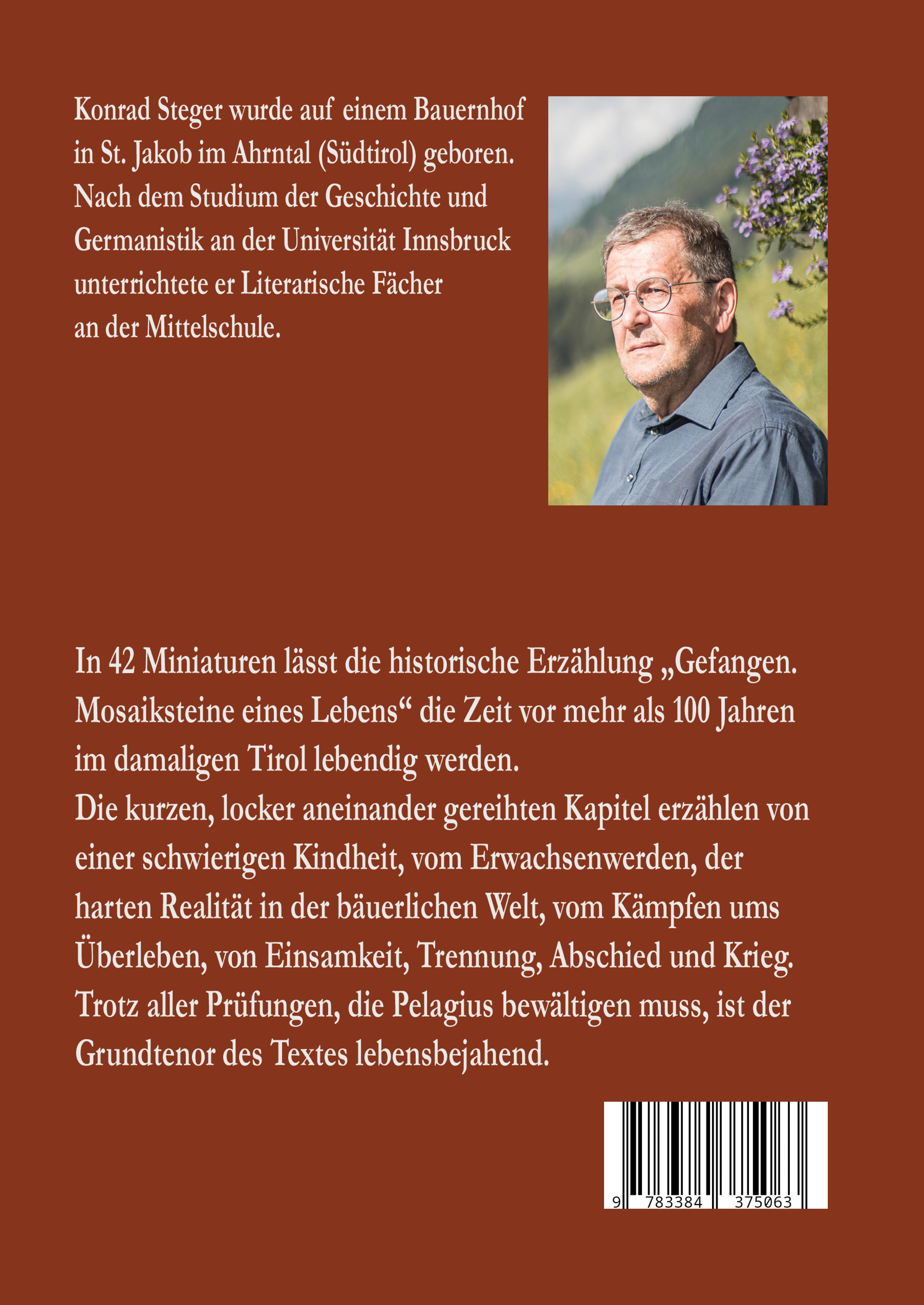 Konrad Steger wurde am 24. März 1959 auf einem kleinen Bauernhof in Südtirol/Italien geboren. Nach dem Studium der Geschichte und Germanistik an der Universität Innsbruck unterrichtete er lange Zeit an der Mittelschule. Weitere Buch- Veröffentlichungen des Autors Konrad Steger: „Der Mann aus der Finsternis“ Ein Südtirol-Krimi, Band 1 "Tod und Vermächtnis" Ein Südtirol-Krimi, Band 2 tredition GmbH, Halenreie 40-44, 22359 Hamburg ISBN Softcover: 978-3-347-47906-7 ISBN E-Book: 978-3-347-47911-1 ______________________________________________________ „Als noch Kartoffelfeuer brannten. Eine Kindheit im Ahrntal“ Athesia-Tappeiner Verlag 2016 ISBN 978-88-6839-170-6 ______________________________________________________ „Als wir noch Kinder waren. Geschichten aus dem Ahrntal“ Athesia-Tappeiner Verlag 2020 ISBN 978-88-6839-495-0