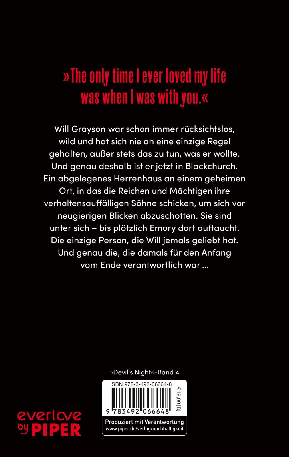 Will Grayson war schon immer rücksichtslos, wild und hat sich nie an eine einzige Regel gehalten, außer genau das zu tun, was er wollte. Und genau deshalb ist er jetzt in Blackchurch. Ein abgelegenes Herrenhaus an einem geheimen Ort, an den die Reichen und Mächtigen ihre verhaltensauffälligen Söhne schicken, um sich vor neugierigen Blicken abzuschotten. Sie sind unter sich - bis plötzlich Emory dort auftaucht. Die einzige Person, die Will jemals geliebt hat. Und genau die, die damals für den Anfang vom Ende verantwortlich war ...