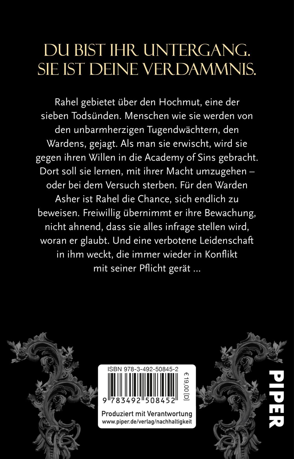 Rahel gebietet über den Hochmut, eine der sieben Todsünden. Menschen wie sie werden von den unbarmherzigen Tugendwächtern, den Wardens, gejagt. Als man sie erwischt, wird sie gegen ihren Willen in die Academy of Sins gebracht. Dort soll sie lernen, mit ihrer Macht umzugehen - oder bei dem Versuch sterben. Für den Warden Asher ist Rahel die Chance, sich endlich zu beweisen. Freiwillig übernimmt er ihre Bewachung, nicht ahnend, dass sie alles infrage stellen wird, woran er glaubt. Und eine verbotene Leidenschaft in ihm weckt, die immer wieder in Konflikt mit seiner Pflicht gerät ...