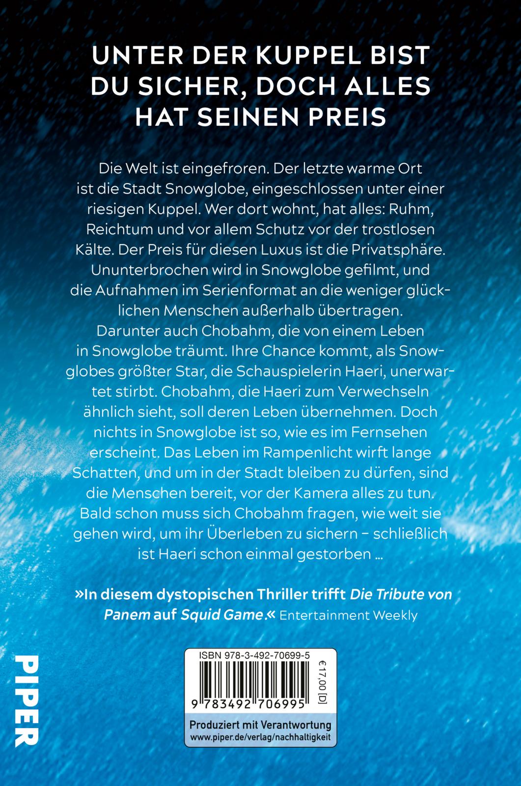 Die Welt ist eingefroren. Nur die Stadt Snowglobe, eingeschlossen unter einer riesigen Kuppel, bietet noch ein komfortables Leben. Doch wer dort wohnt, bezahlt mit seiner Privatsphäre: Konstant wird ihr Leben für die weniger glücklichen Menschen außerhalb gefilmt. Die junge Chobahm träumt davon, eines Tages selbst in Snowglobe zu leben. Ihre Chance kommt, als eine der Schauspielerinnen unerwartet stirbt und Chobahm deren Platz und Leben einnehmen soll. Doch ihre neue Rolle im Rampenlicht wirft lange Schatten - und garantiert noch lange nicht Chobahms Überleben ...