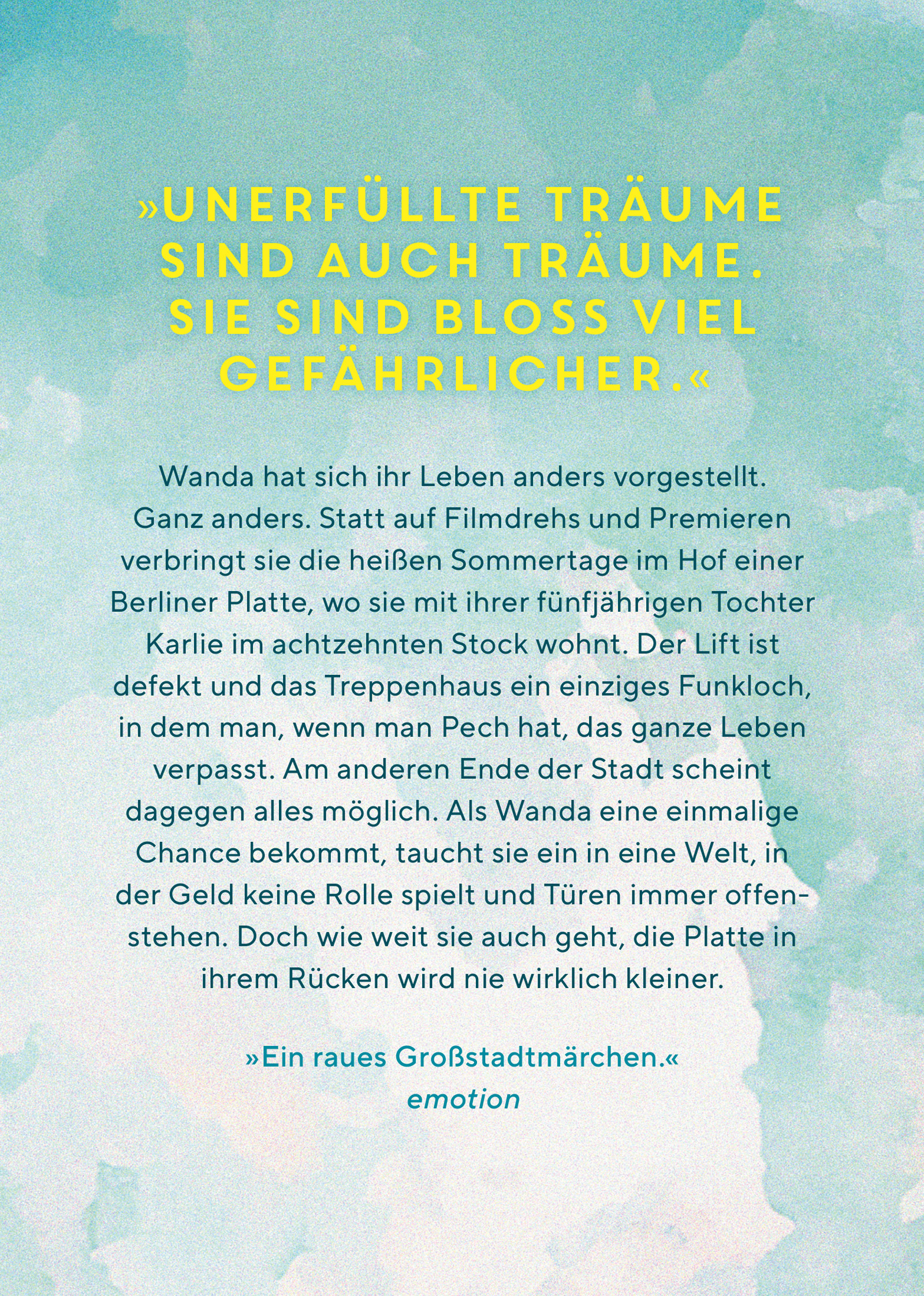 »Unerfüllte Träume sind auch Träume. Sie sind bloß viel gefährlicher.« – Wanda hat sich ihr Leben anders vorgestellt. Ganz anders. Statt auf Filmdrehs und Premieren verbringt sie die heißen Sommertage im Hof einer Berliner Platte, wo sie mit ihrer fünfjährigen Tochter Karlie im achtzehnten Stock wohnt. Der Lift ist defekt und das Treppenhaus ein einziges Funkloch, in dem man, wenn man Pech hat, das ganze Leben verpasst. Am anderen Ende der Stadt scheint dagegen alles möglich. Als Wanda eine einmalige Chance bekommt, taucht sie ein in eine Welt, in der Geld keine Rolle spielt und Türen immer offenstehen. Doch wie weit sie auch geht, die Platte in ihrem Rücken wird nie wirklich kleiner.