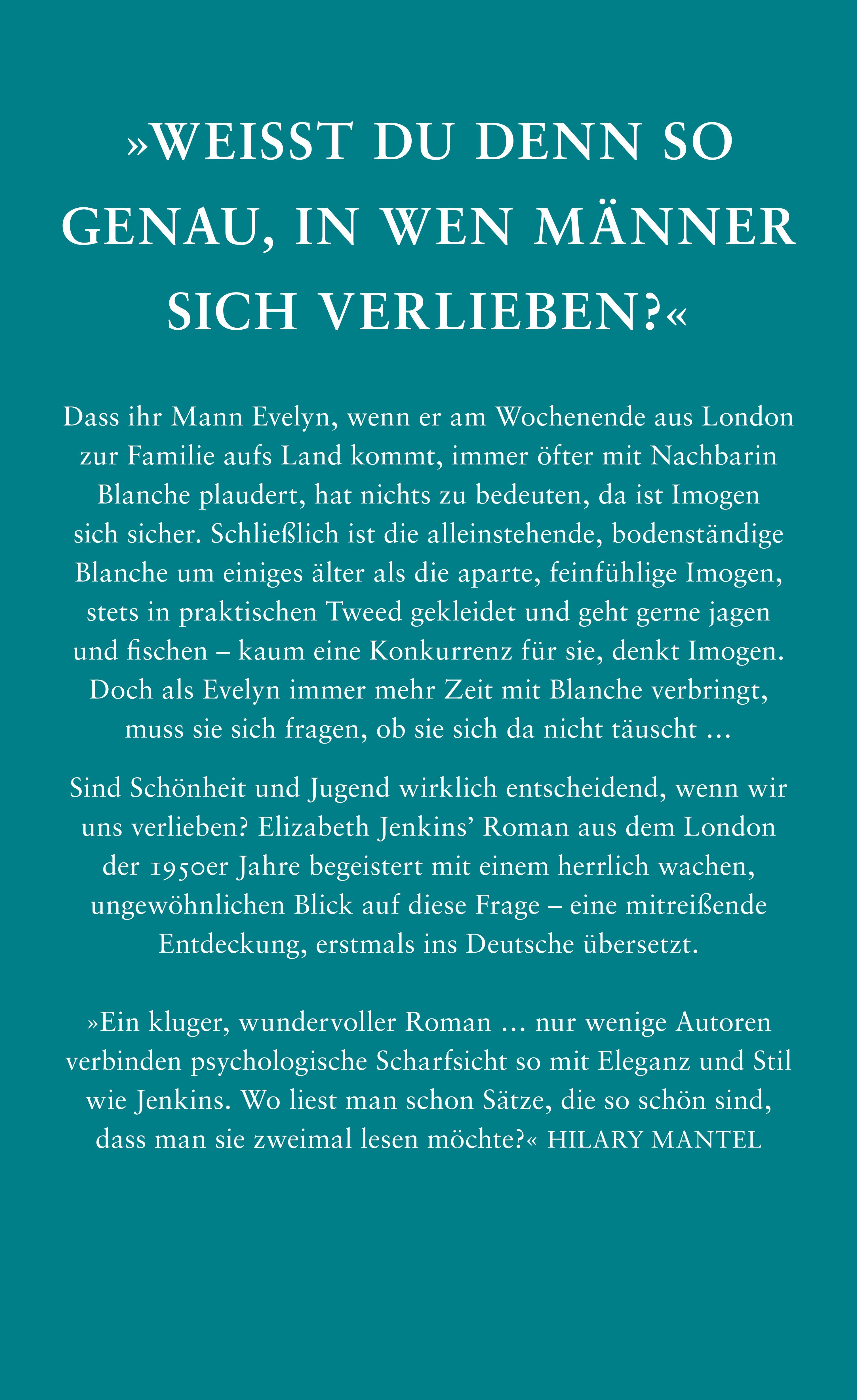 Dass ihr Mann Evelyn, wenn er am Wochenende aus London zur Familie aufs Land kommt, immer öfter mit Nachbarin Blanche plaudert, hat nichts zu bedeuten, da ist Imogen sich sicher. Schließlich ist die alleinstehende, bodenständige Blanche um einiges älter als die aparte, feinfühlige Imogen, stets in praktischen Tweed gekleidet und geht gerne jagen und fischen - eine Frau, die Imogen locker in den Schatten stellt. Doch als Evelyn immer mehr Zeit mit Blanche verbringt, muss sie sich fragen, ob sie sich da nicht täuscht ...