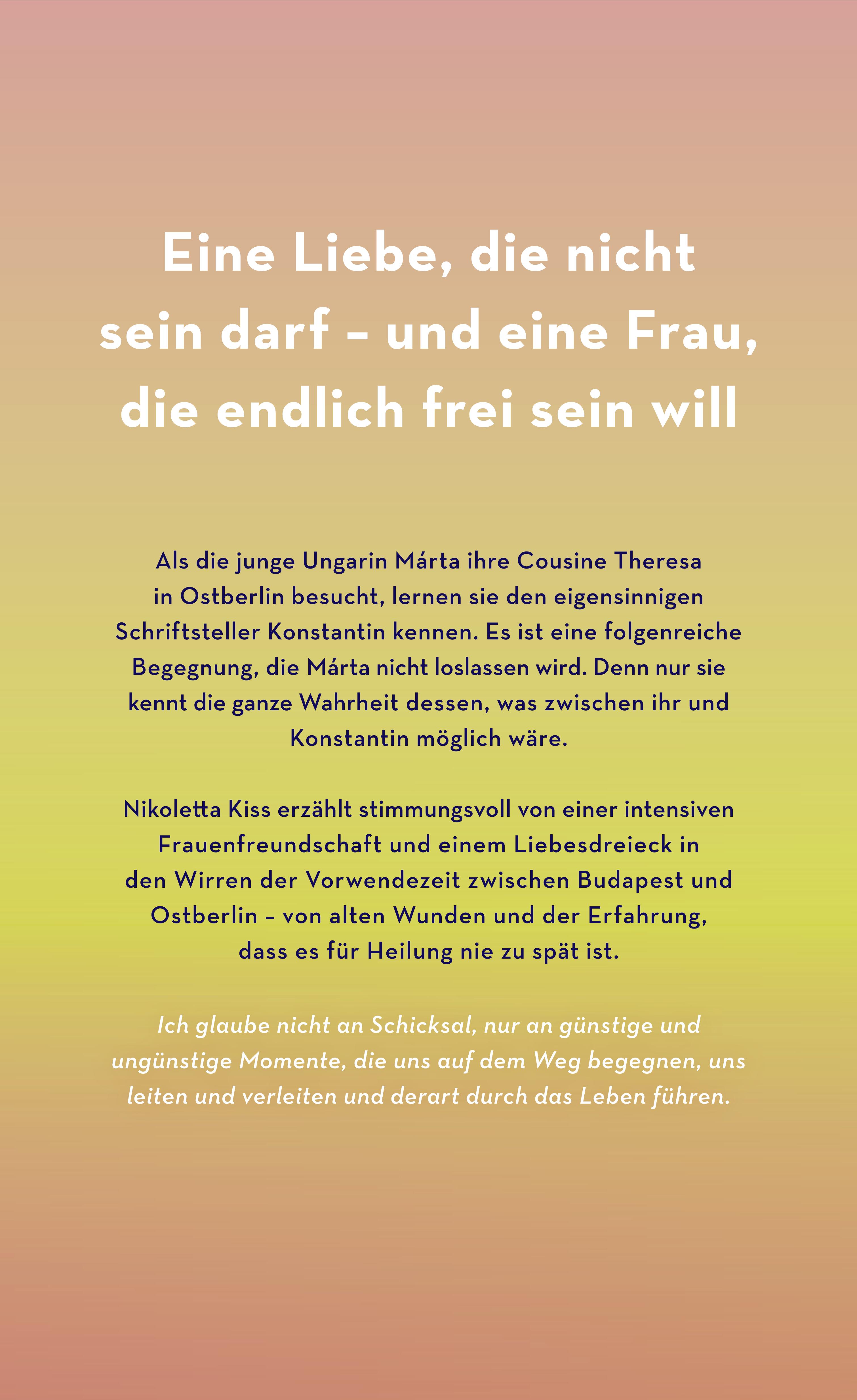 Nikoletta Kiss erzählt stimmungsvoll von einer intensiven Frauenfreundschaft und einem Liebesdreieck in den Wirren der Vorwendezeit - von alten Wunden und der Erfahrung, dass es für Heilung nie zu spät ist.