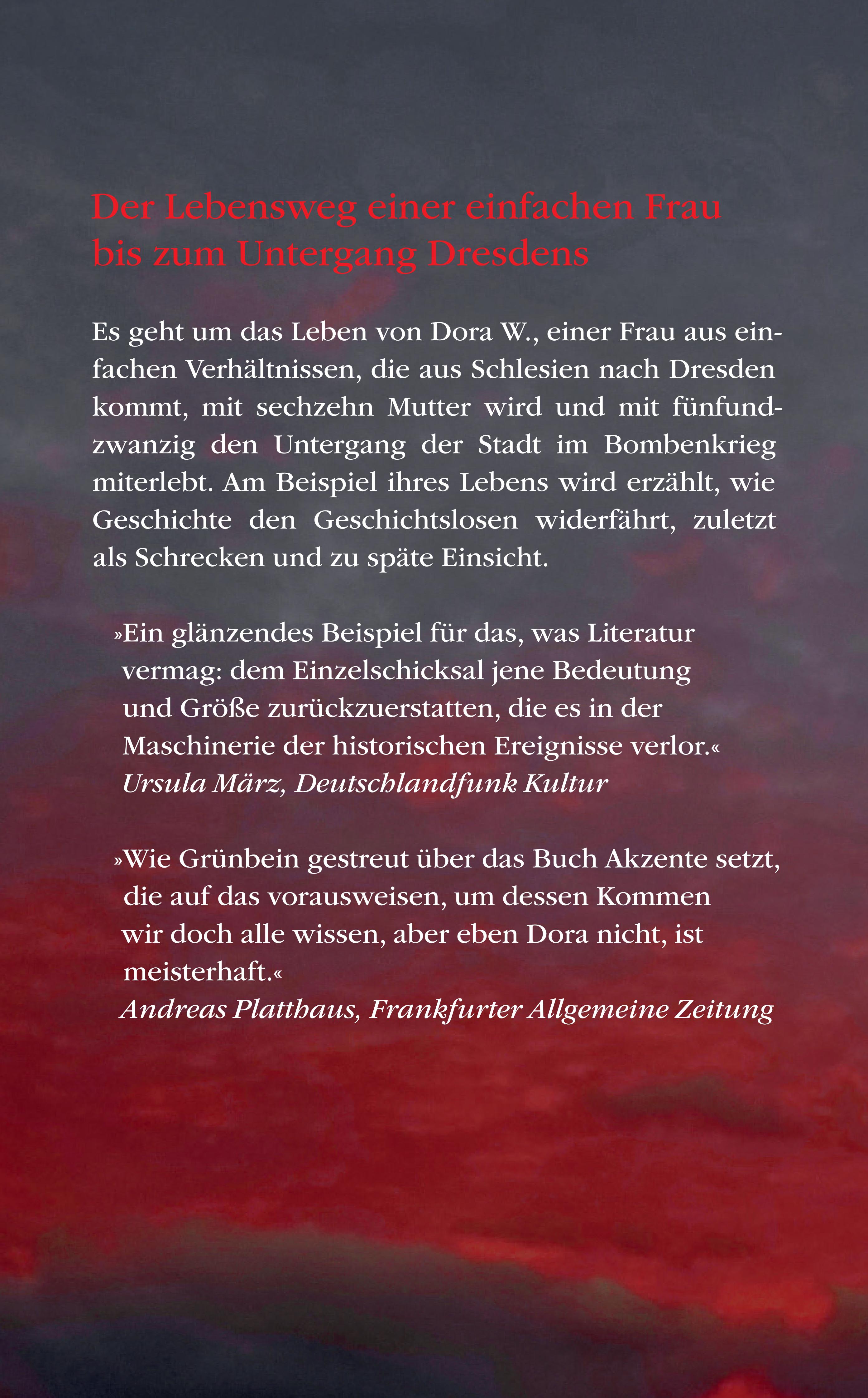 »Brillant, wie da das nationalsozialistische Dresden topographiert wird ... Wie Grünbein gestreut über das Buch Akzente setzt ... die auf das vorausweisen, um dessen Kommen wir doch alle wissen, aber eben [die Protagonistin] Dora nicht, ist meisterhaft.«
