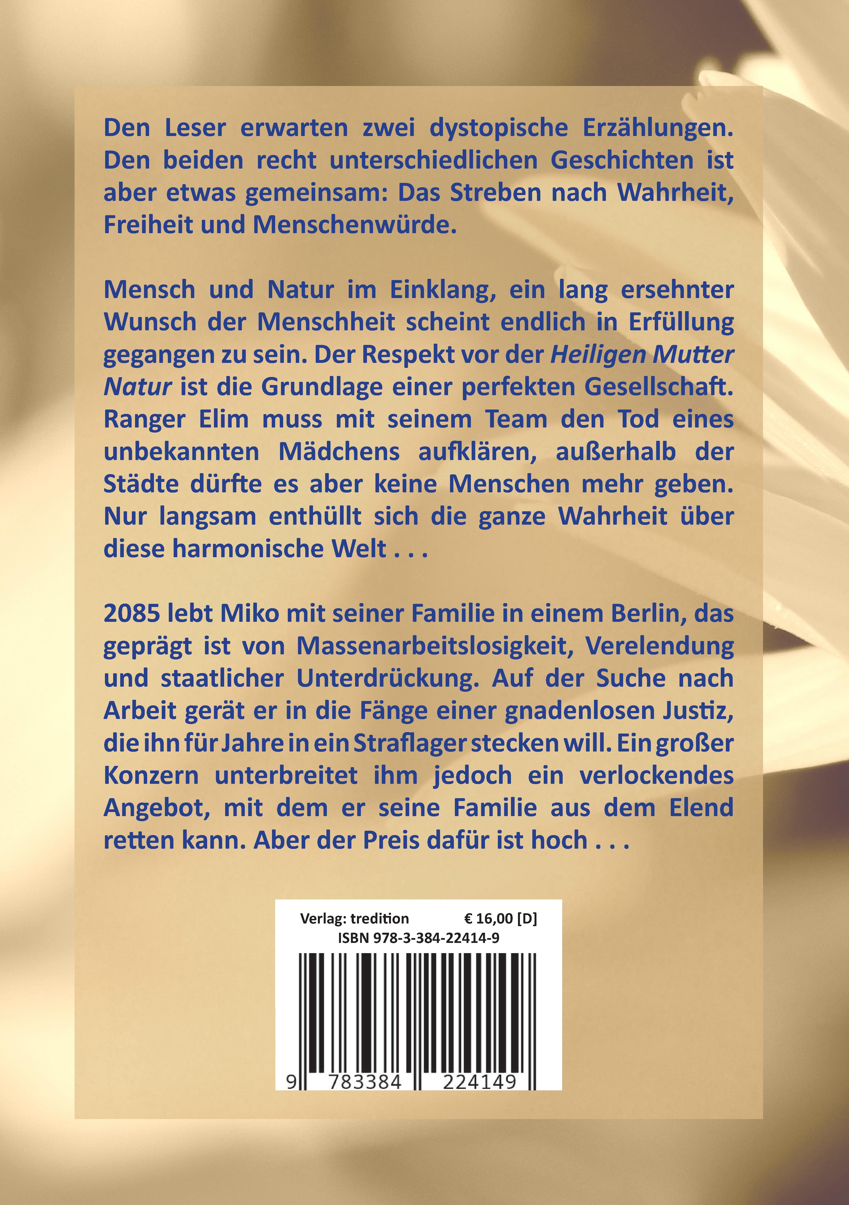 Den Leser erwarten zwei dystopische Erzählungen. Den beiden recht unterschiedlichen Geschichten ist aber etwas gemeinsam: Das Streben nach Wahrheit, Freiheit und Menschenwürde.Mensch und Natur im Einklang, ein lang ersehnter Wunsch der Menschheit scheint endlich in Erfüllung gegangen zu sein. Der Respekt vor der Heiligen Mutter Natur ist die Grundlage einer perfekten Gesellschaft. Ranger Elim muss mit seinem Team den Tod eines unbekannten Mädchens aufklären, außerhalb der Städte dürfte es aber keine Menschen mehr geben. Nur langsam enthüllt sich die ganze Wahrheit über diese harmonische Welt . . .2085 lebt Miko mit seiner Familie in einem Berlin, das geprägt ist von Massenarbeitslosigkeit, Verelendung und staatlicher Unterdrückung. Auf der Suche nach Arbeit gerät er in die Fänge einer gnadenlosen Justiz, die ihn für Jahre in ein Straflager stecken will. Ein großer Konzern unterbreitet ihm jedoch ein verlockendesAngebot, mit dem er seine Familie aus dem Elend retten kann. Aber der Preis dafür ist hoch . . .