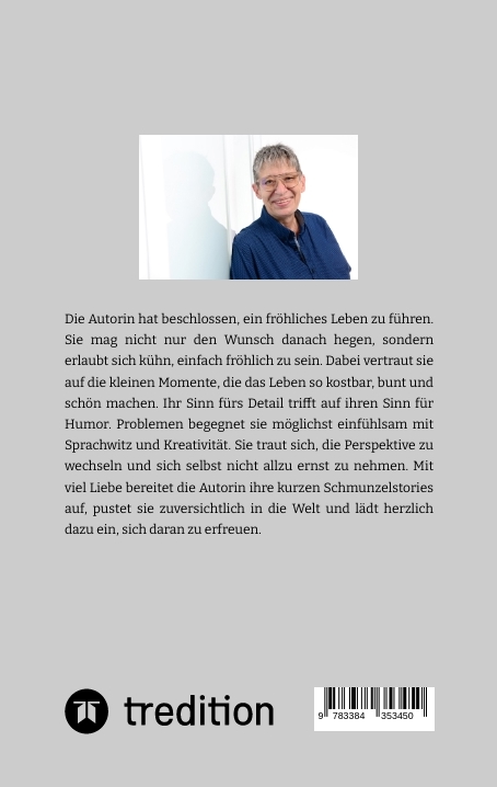 Die Autorin hat beschlossen, ein fröhliches Leben zu führen. Sie mag nicht nur den Wunsch danach hegen, sondern erlaubt sich kühn, einfach fröhlich zu sein. Dabei vertraut sie auf die kleinen Momente, die das Leben so kostbar, bunt und schön machen. Ihr Sinn fürs Detail trifft auf ihren Sinn für Humor. Problemen begegnet sie möglichst einfühlsam mit Sprachwitz und Kreativität. Sie traut sich, die Perspektive zu wechseln und sich selbst nicht allzu ernst zu nehmen. Mit viel Liebe bereitet die Autorin ihre kurzen Schmunzelstories auf, pustet sie zuversichtlich in die Welt und lädt herzlich dazu ein, sich daran zu erfreuen.