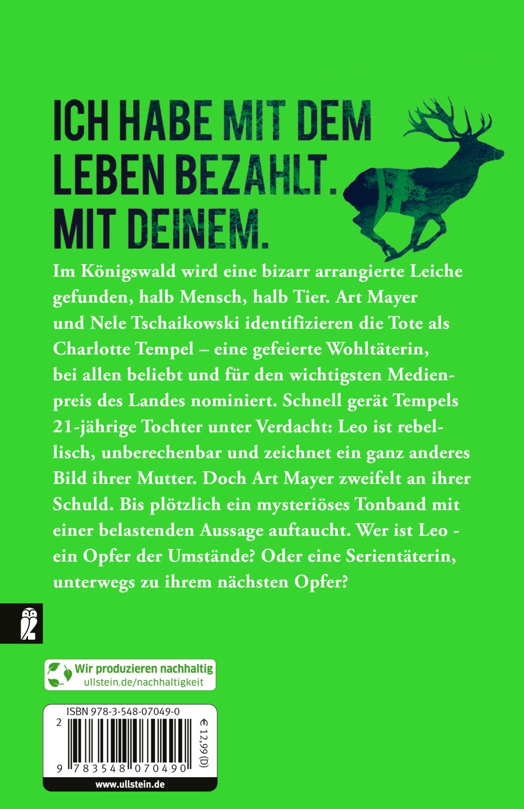 Im Königswald wird eine bizarr arrangierte Leiche gefunden, halb Mensch, halb Tier. Art Mayer und Nele Tschaikowski identifizieren die Tote als Charlotte Tempel - eine gefeierte Wohltäterin, bei allen beliebt und für den wichtigsten Medienpreis des Landes nominiert.