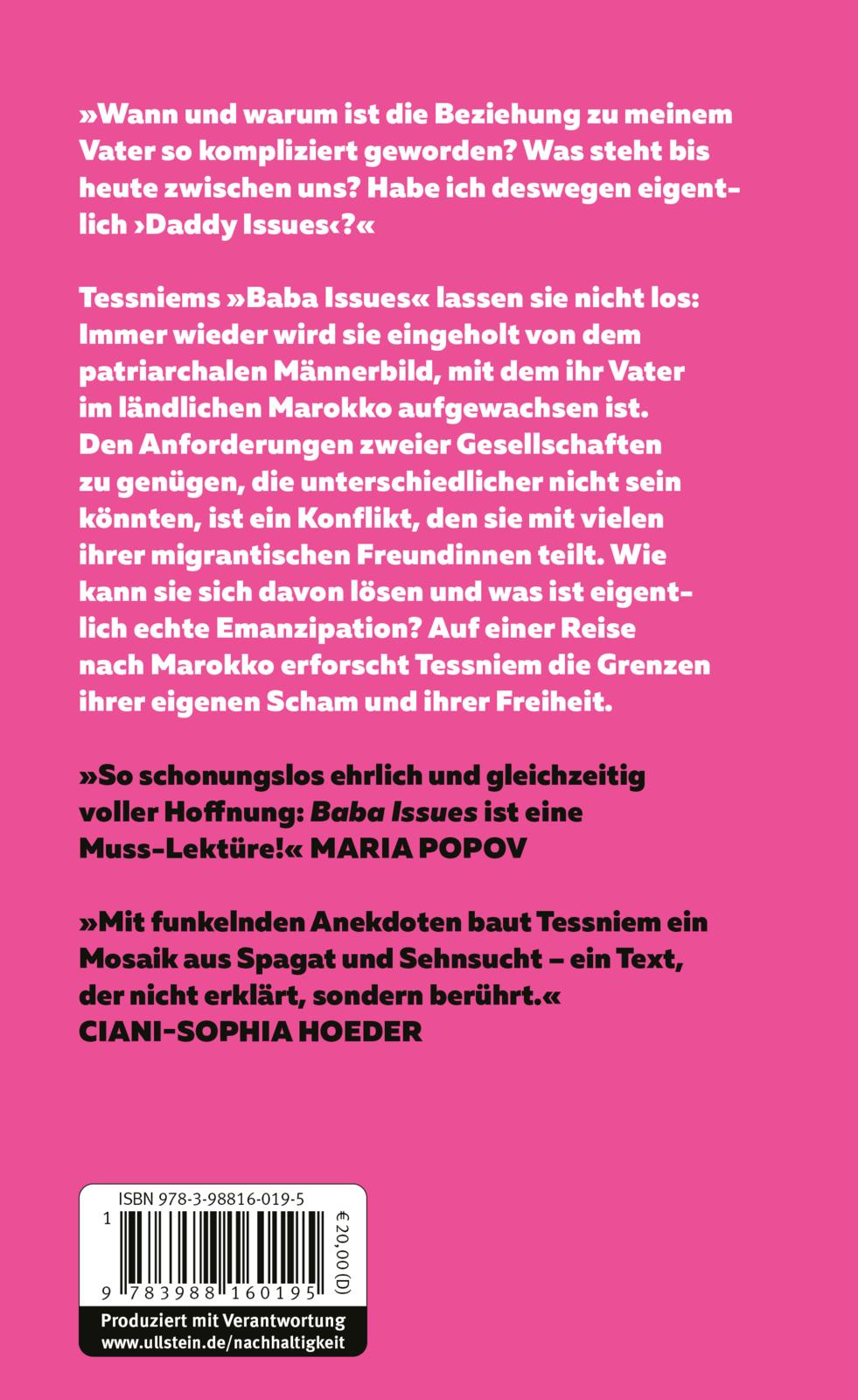 Tessniems Baba Issues lassen sie nicht los: Versagt das toxische Männerbild, mit dem ihr Vater im ländlichen Marokko aufgewachsen ist, es ihm, einen liebevollen Umgang mit seinen Töchtern zu pflegen? Wäre alles anders, wenn eine ältere Schwester all diese Kämpfe für sie ausgetragen hätte? Was ist echte Emanzipation? In ihrem Debüt macht sie sich auf eine literarische Suche nach Antworten.