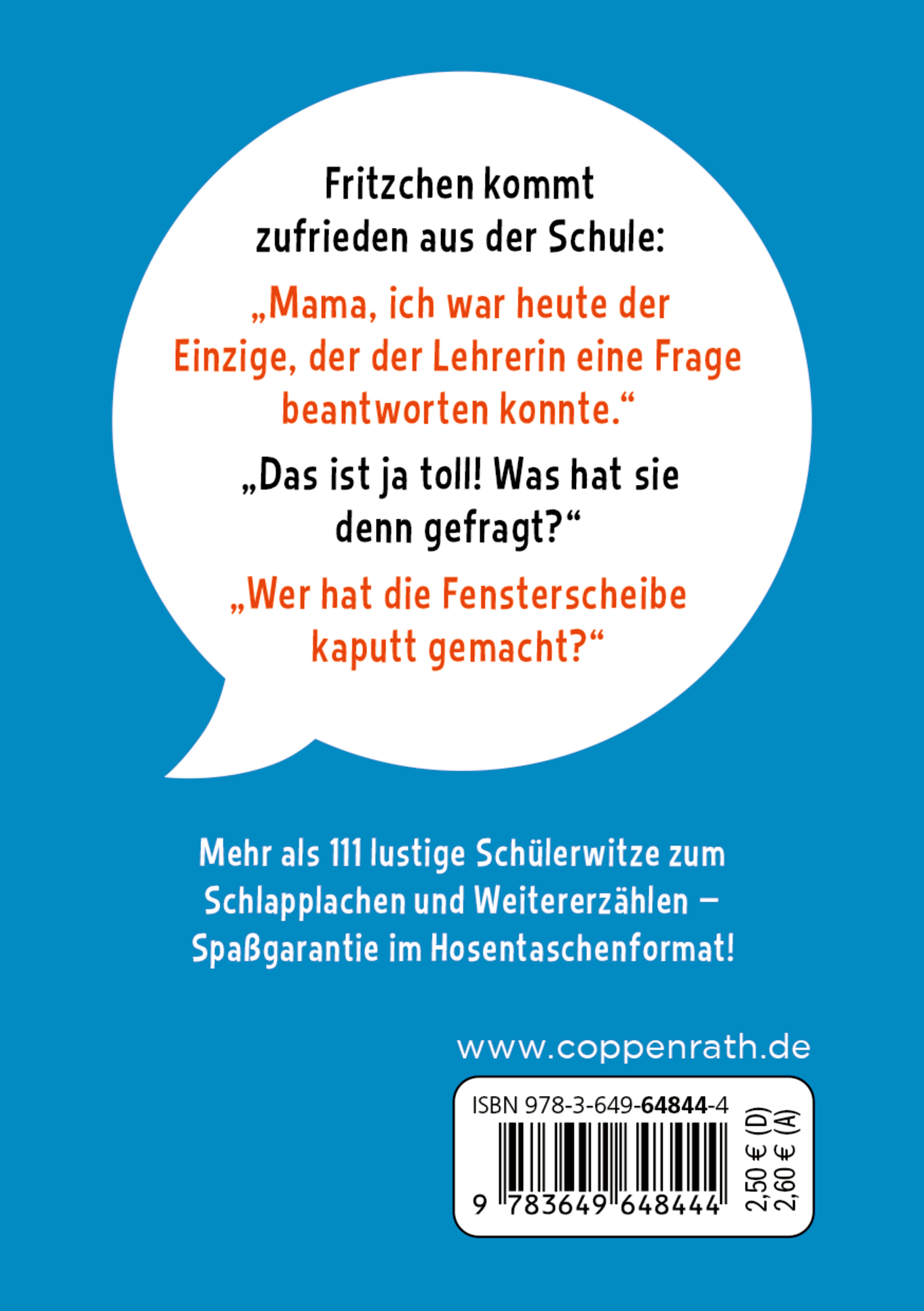 Egal ob Schülerwitze, Lehrerwitze, Pausenwitze oder Sportwitze – in jedem der vier kleinen Witzebücher finden sich mehr als 111 lustige Witze zum Kichern und Schlapplachen. Spaßgarantie im Hosentaschenformat. Ein perfektes Mitbringsel für Jungen und Mädchen und ideal für Schultüte, Adventskalender, Mitgebseltüten oder als kleines Geschenk.