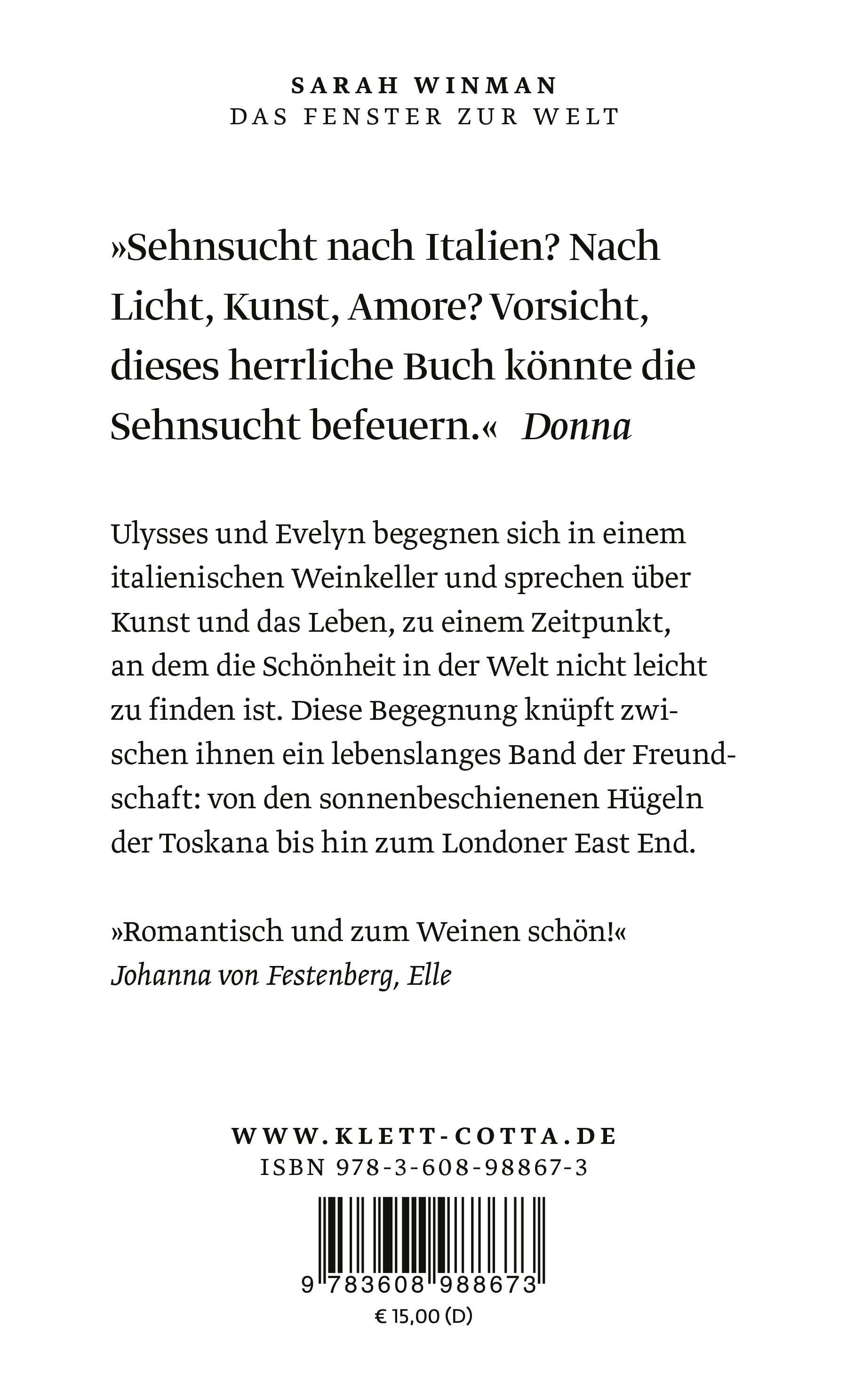 Ulysses und Evelyn begegnen sich in einem italienischen Weinkeller und sprechen über Kunst und das Leben, zu einem Zeitpunkt, an dem die Schönheit in der Welt nicht leicht zu finden ist. Diese Begegnung knüpft zwischen ihnen ein lebenslanges Band der Freundschaft. Von den sonnenbeschienenen Hügeln der Toskana bis hin zum Londoner East End ist »Das Fenster zur Welt« ein lebensbejahender Roman über Schicksal, Liebe und Familie.