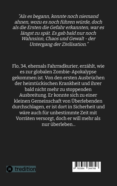 "Als es begann, konnte noch niemand ahnen, wozu es noch führen würde, doch als die Ersten die Gefahr erkannten, war es längst zu spät. Es gab bald nur noch Wahnsinn, Chaos und Gewalt - der Untergang der Zivilisation."Flo, 34, ehemals Fahrradkurier, erzählt, wie es zur globalen Zombie-Apokalypse gekommen ist. Von den ersten Ausbrüchen der heimtückischen Krankheit und ihrer bald nicht mehr zu stoppenden Ausbreitung. Er konnte sich zu einer kleinen Gemeinschaft von Überlebenden durchschlagen, er ist dort in Sicherheit und wäre auch für unbestimmte Zeit mit Vorräten versorgt, doch er will mehr als nur überleben...