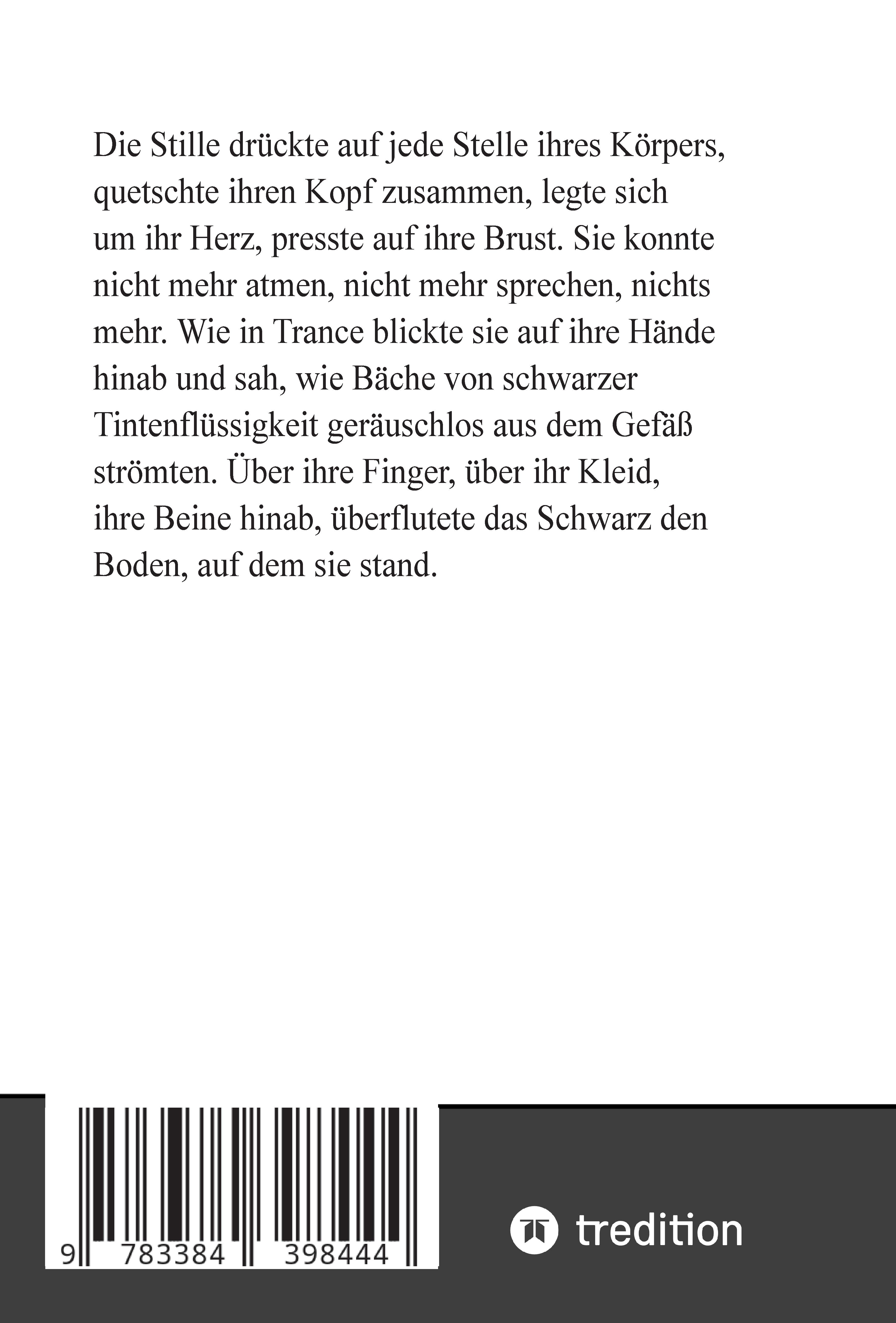 "Die Stille drückte auf jede Stelle ihres Körpers, quetschte ihren Kopf zusammen, legte sich um ihr Herz, presste auf ihre Brust. Sie konnte nicht mehr atmen, nicht mehr sprechen, nichts mehr. Wie in Trance blickte sie auf ihre Hände hinab und sah, wie Bäche von schwarzer Tintenflüssigkeit geräuschlos aus dem Gefäß strömten. Über ihre Finger, über ihr Kleid, ihre Beine hinab, überflutete das Schwarz den Boden, auf dem sie stand."*"Was war denn das hier für ein seltsamer Ort? Weit und breit nichts, überhaupt nichts. Nur grauer Dunst in dieser sonderbaren Dimension, die ansonsten völlig leer zu sein schien. Tagelang traf man hier nicht auf das geringste Etwas, keinen Menschen, kein Tier, nicht einmal Land oder Meer, nicht einmal ein Sandkorn. Und absolute Stille herrschte hier. Es war unheimlich, als ob man in einem Vakuum verloren gegangen wäre."