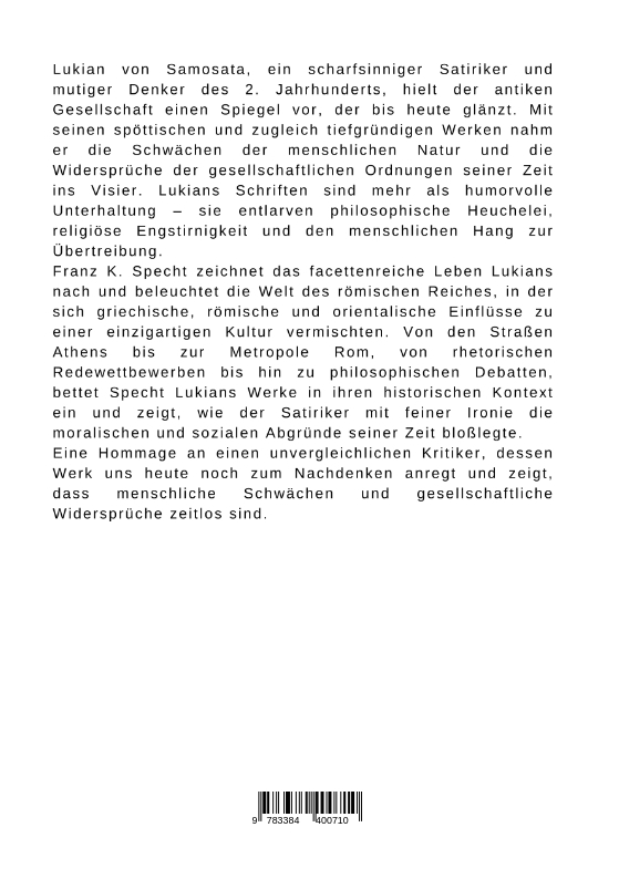 Lukian von Samosata, ein scharfsinniger Satiriker und mutiger Denker des 2. Jahrhunderts, hielt der antiken Gesellschaft einen Spiegel vor, der bis heute glänzt. Mit seinen spöttischen und zugleich tiefgründigen Werken nahm er die Schwächen der menschlichen Natur und die Widersprüche der gesellschaftlichen Ordnungen seiner Zeit ins Visier. Lukians Schriften sind mehr als humorvolle Unterhaltung - sie entlarven philosophische Heuchelei, religiöse Engstirnigkeit und den menschlichen Hang zur Übertreibung.Franz K. Specht zeichnet das facettenreiche Leben Lukians nach und beleuchtet die Welt des römischen Reiches, in der sich griechische, römische und orientalische Einflüsse zu einer einzigartigen Kultur vermischten. Von den Straßen Athens bis zur Metropole Rom, von rhetorischen Redewettbewerben bis hin zu philosophischen Debatten, bettet Specht Lukians Werke in ihren historischen Kontext ein und zeigt, wie der Satiriker mit feiner Ironie die moralischen und sozialen Abgründe seiner Zeit bloßlegte.Eine Hommage an einen unvergleichlichen Kritiker, dessen Werk uns heute noch zum Nachdenken anregt und zeigt, dass menschliche Schwächen und gesellschaftliche Widersprüche zeitlos sind.