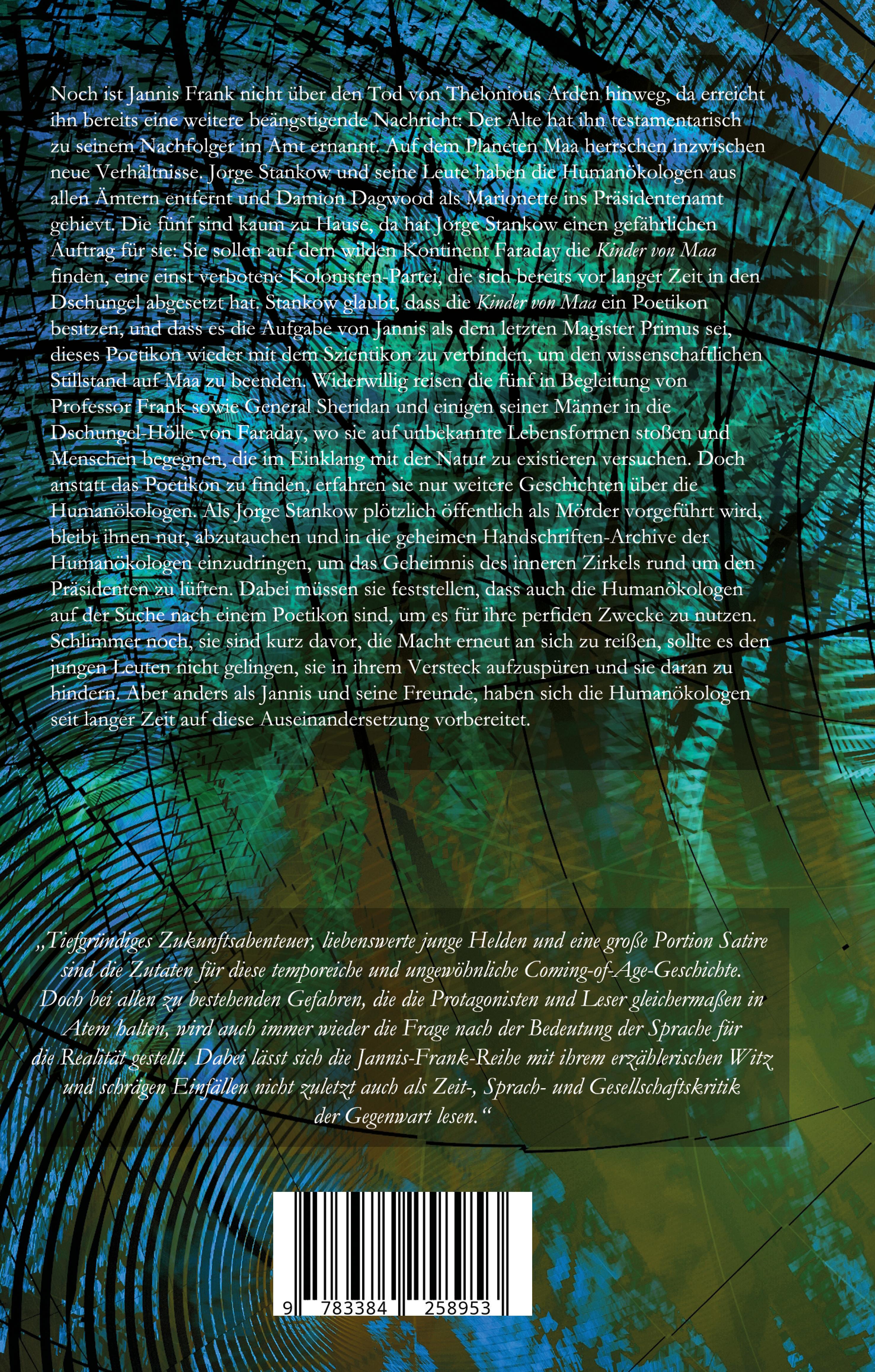 Noch ist Jannis Frank nicht über den Tod von Thelonious Arden hinweg, da erreicht ihn eine weitere beängstigende Nachricht: Der Alte hat ihn testamentarisch zu seinem Nachfolger im Amt ernannt. Auf dem Planeten Maa herrschen inzwischen neue Verhältnisse. Jorge Stankow und seine Leute haben die Humanökologen aus allen Ämtern entfernt und Damion Dagwood als Marionette ins Präsidentenamt gehievt. Jannis und seine Freunde sind kaum zu Hause, da hat Jorge Stankow einen gefährlichen Auftrag für sie: Sie sollen auf dem wilden Kontinent Faraday die Kinder von Maa finden, eine einst verbotene Kolonisten-Partei, die sich vor langer Zeit in den Dschungel abgesetzt hat. Stankow glaubt, dass die Kinder ein Poetikon besitzen, und dass es die Aufgabe von Jannis als dem letzten Magister Primus sei, dieses Poetikon wieder mit dem Szientikon zu verbinden, um den wissenschaftlichen Stillstand auf Maa zu beenden. Widerwillig reisen die fünf in Begleitung von Professor Frank sowie General Sheridan und einigen seiner Männer in die Dschungel-Hölle von Faraday, wo sie auf unbekannte Lebensformen stoßen und Menschen begegnen, die im Einklang mit der Natur zu existieren versuchen. Doch anstatt das Poetikon zu finden, erfahren sie nur weitere Geschichten über die Humanökologen. Als Jorge Stankow plötzlich öffentlich als Mörder vorgeführt wird, bleibt ihnen nur, abzutauchen und in die geheimen Handschriften-Archive der Humanökologen einzudringen, um das Geheimnis des inneren Zirkels rund um den Präsidenten zu lüften. Dabei müssen sie feststellen, dass auch die Humanökologen auf der Suche nach einem Poetikon sind, um es für ihre perfiden Zwecke zu nutzen. Schlimmer noch, sie sind kurz davor, die Macht erneut an sich zu reißen, sollte es den jungen Leuten nicht gelingen, sie in ihrem Versteck aufzuspüren und sie daran zu hindern. Aber anders als Jannis und seine Freunde, haben sich die Humanökologen seit langer Zeit auf diese Auseinandersetzung vorbereitet."Tiefgründiges Zukunftsabenteuer, liebenswerte junge Helden und eine große Portion Satire sind die Zutaten für diese temporeiche und ungewöhnliche Coming-of-Age-Geschichte. Doch bei allen zu bestehenden Gefahren, die die Protagonisten und Leser gleichermaßen in Atem halten, wird auch immer wieder die Frage nach der Bedeutung der Sprache für die Realität gestellt. Dabei lässt sich die Jannis-Frank-Reihe mit ihrem erzählerischen Witz und schrägen Einfällen nicht zuletzt als Zeit-, Sprach- und Gesellschaftskritik der Gegenwart lesen."