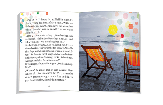 Wäre ein Leben voller Fest- und Feiertage erstrebenswert? Wer dem Alltag in dieser liebevoll erzählten Geschichte folgt, macht eine erstaunliche Entdeckung: Nicht alles ist so grau wie es zu sein scheint. Dieses Buch ist wie ein kleiner Lichtstrahl, der hilft, an jedem Tag bunte Farbtupfer aufzuspüren.