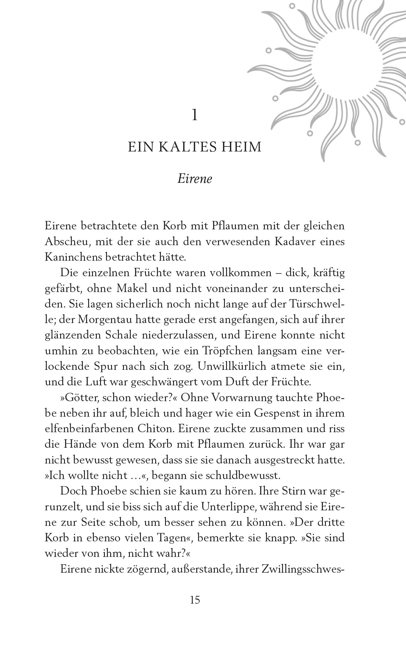 »Eirene.« Damon kniete sich neben sie. »Ist mit dir alles in Ordnung? Es tut mir leid, mir war nicht klar, dass du es nicht wusstest. Ich hatte vergessen, dass ihr Freundinnen gewesen seid, sonst hätte ich nie …« »Wann ist sie gestorben?«, unterbrach Eirene ihn. Sie strich sich das Haar aus dem Gesicht und plötzlich war ihr die Berührung ihrer Locken auf ihren Wangen verhasst. Ihr war, als würde ihr der Boden unter den Füßen weggezogen. »Vor fünf Tagen. In der Nacht, glaube ich, doch mein Meister wurde gleich am nächsten Morgen in aller Frühe gerufen.« Fünf Tage. So wenig Zeit war vergangen. Leandros’ erstes Geschenk für Phoebe war bereits zwei Tage später angekommen. Damon senkte die Stimme. »Und das ist nicht alles.« Er beugte sich wieder vor. Eirene lehnte sich ein ganz klein wenig zurück; sie ertrug es nicht, jemandem so nahe zu sein. Gleich würden ihr die Tränen kommen, davon war sie überzeugt, doch Damon schien es nicht zu bemerken. Seine Wangen waren noch immer gerötet vor Aufregung über sein Geheimnis. »Gestern Nacht habe ich meinen Meister mit dem alten Otus reden hören, der die Gräber der verstorbenen Patienten aushebt. Er muss auch Alexandra begraben haben, denn die beiden sind sich einig gewesen, dass es kein gewöhnlicher Todesfall war. Ich meine, kein natürlicher Todesfall. Sie haben gesagt, irgendetwas Schreckliches, etwas Furchtbares sei ihr zugestoßen.« »Ihr ist etwas zugestoßen«, wiederholte Eirene im Flüsterton. Damon nickte. »Etwas stimmte wohl nicht mit ihrem Körper. Als hätte ein Tier sie zerfleischt, irgendeine wilde Bestie. Ein Wolf vielleicht oder ein Bär oder ein Löwe.« Er beugte sich wieder vor, und diesmal wich Eirene nicht zurück. Damon sprach jetzt so leise, dass sie Mühe hatte, ihn zu verstehen. »Mein Meister sagt, sie sei –« »Nun, ich störe nur ungern eure kleine Romanze«, unterbrach ihn eine harte, gereizte Stimme.