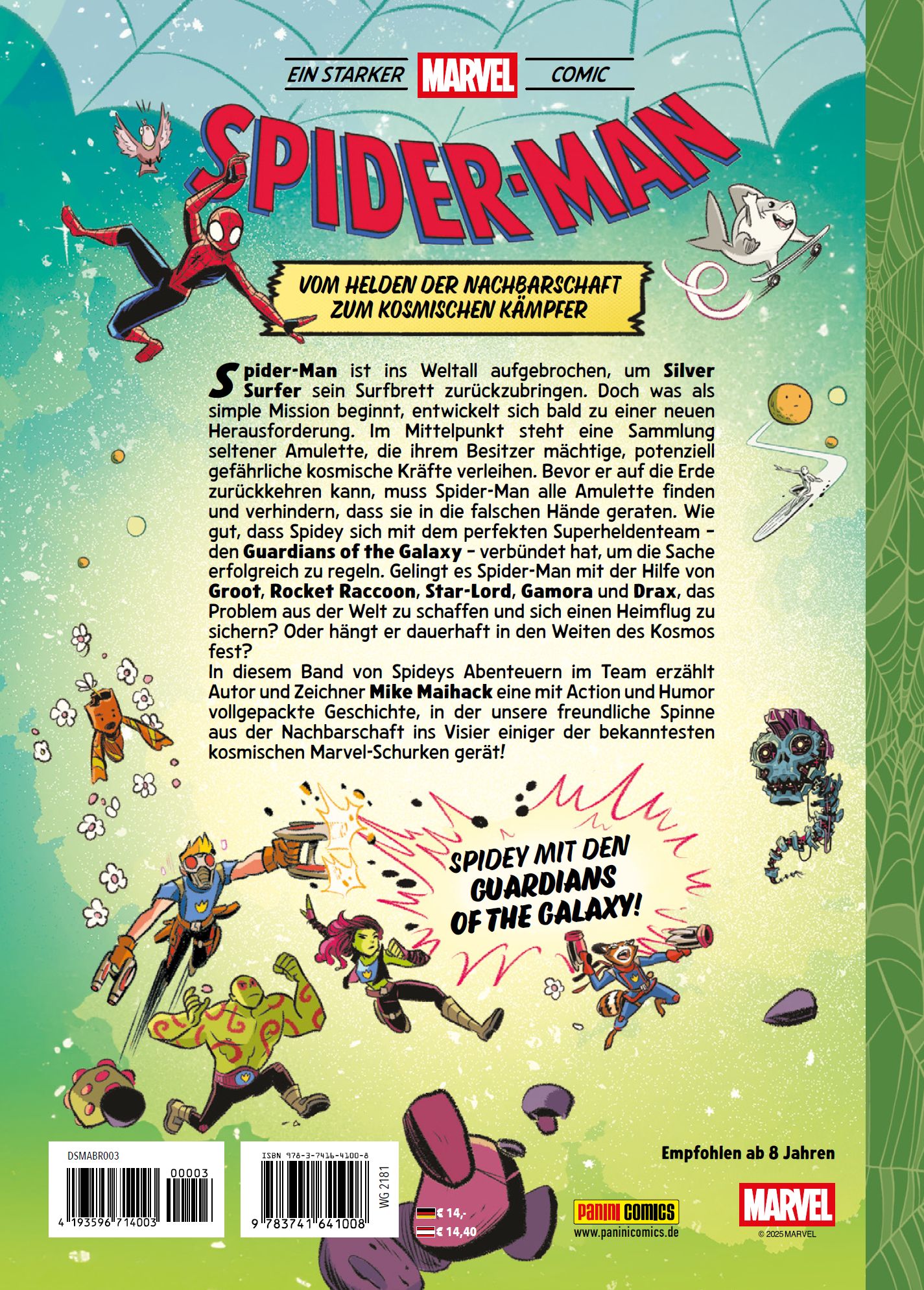 VOM HELDEN DER NACHBARSCHAFT ZUM KOSMISCHEN KÄMPFERSpider-Man ist ins Weltall aufgebrochen, um dem kosmischen Silver Surfer sein Surfbrett zurückzubringen. Doch was als simple Mission beginnt, entwickelt sich bald zu einer neuen Herausforderung. Im Mittelpunkt steht eine Sammlung seltener Amulette, die ihrem Besitzer mächtige, potenziell gefährliche kosmische Kräfte verleihen. Bevor er auf die Erde zurückkehren kann, muss Spider-Man alle Amulette finden und verhindern, dass sie in die falschen Hände geraten. Wie gut, dass Spidey sich mit dem perfekten Superheldenteam - den Guardians of the Galaxy - verbündet hat, um die Sache erfolgreich zu regeln. Gelingt es Spider-Man, mit der Hilfe von Groot, Rocket Raccoon, Star-Lord, Gamora und Drax das Problem aus der Welt zu schaffen und sich einen Heimflug zu sichern? Oder hängt er dauerhaft in den Weiten des Kosmos fest? In diesem Band von Spideys Abenteuer im Team erzählt Autor und Zeichner Mike Maihack eine mit Action und Humor vollgepackte Geschichte, in der unsere freundliche Spinne aus der Nachbarschaft ins Visier einiger der bekanntesten kosmischen Marvel-Schurken gerät!SPIDEY MIT DEN GUARDIANS OF THE GALAXY!