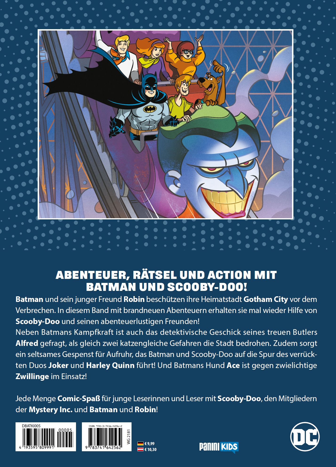 ABENTEUER, RÄTSEL UND ACTION MIT BATMAN UND SCOOBY-DOO!Batman und sein junger Freund Robin beschützen ihre Heimatstadt Gotham City vor dem Verbrechen. In diesem Band mit brandneuen Abenteuern erhalten sie mal wieder Hilfe von Scooby-Doo und seinen abenteuerlustigen Freunden!Neben Batmans Kampfkraft ist auch das detektivische Geschick seines treuen Butlers Alfred gefragt, als gleich zwei katzengleiche Gefahren die Stadt bedrohen. Zudem sorgt ein seltsames Gespenst für Aufruhr, das Batman und Scooby-Doo auf die Spur des verrückten Duos Joker und Harley Quinn führt! Und Batmans Hund Ace ist gegen zwielichtige Zwillinge im Einsatz!Jede Menge Comic-Spaß für junge Leserinnen und Leser mit Scooby-Doo, den Mitgliedern der Mystery Inc. und Batman und Robin!