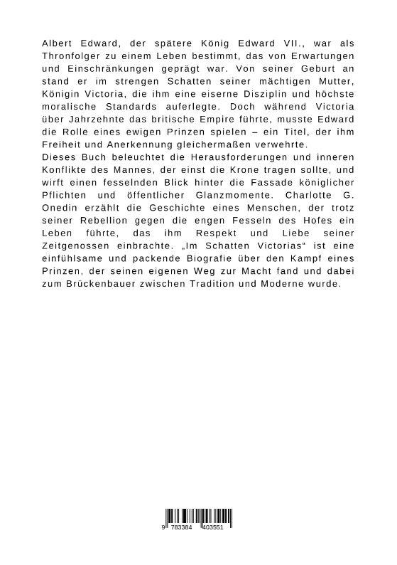 Albert Edward, der spätere König Edward VII., war als Thronfolger zu einem Leben bestimmt, das von Erwartungen und Einschränkungen geprägt war. Von seiner Geburt an stand er im strengen Schatten seiner mächtigen Mutter, Königin Victoria, die ihm eine eiserne Disziplin und höchste moralische Standards auferlegte. Doch während Victoria über Jahrzehnte das britische Empire führte, musste Edward die Rolle eines ewigen Prinzen spielen - ein Titel, der ihm Freiheit und Anerkennung gleichermaßen verwehrte.Dieses Buch beleuchtet die Herausforderungen und inneren Konflikte des Mannes, der einst die Krone tragen sollte, und wirft einen fesselnden Blick hinter die Fassade königlicher Pflichten und öffentlicher Glanzmomente. Charlotte G. Onedin erzählt die Geschichte eines Menschen, der trotz seiner Rebellion gegen die engen Fesseln des Hofes ein Leben führte, das ihm Respekt und Liebe seiner Zeitgenossen einbrachte. "Im Schatten Victorias" ist eine einfühlsame und packende Biografie über den Kampf eines Prinzen, der seinen eigenen Weg zur Macht fand und dabei zum Brückenbauer zwischen Tradition und Moderne wurde.