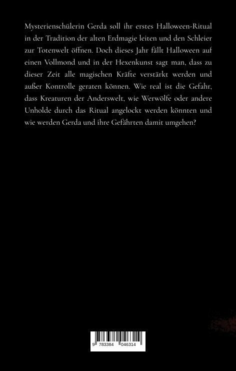 Mysterienschülerin Gerda soll ihr erstes Halloween-Ritual in der Tradition der alten Erdmagie leiten und den Schleier zur Totenwelt öffnen. Doch dieses Jahr fällt Halloween auf einen Vollmond und in der Hexenkunst sagt man, dass zu dieser Zeit alle magischen Kräfte verstärkt werden und außer Kontrolle geraten können. Wie real ist die Gefahr, dass Kreaturen der Anderswelt wie Werwölfe oder andere Unholde durch das Ritual angelockt werden könnten und wie werden Gerda und ihre Gefährten damit umgehen?Okkulte Fiktion basierend auf tatsächlichen Praktiken und Erfahrungen in der Magie und den westlichen Mysterien mit ausführlichem Glossar im Anhang.