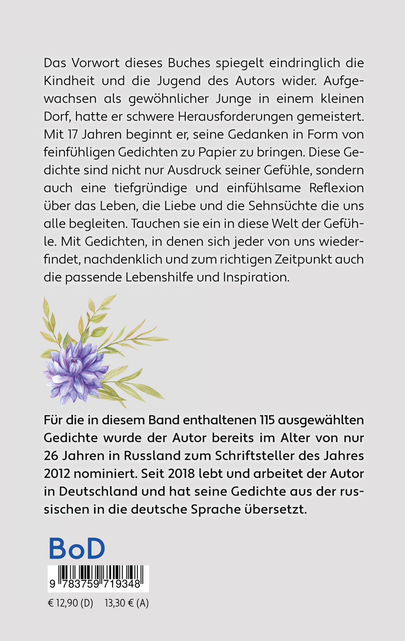 Für die in diesem Band enthaltenen 115 ausgewählten Gedichte wurde der Autor bereits im Alter von nur 26 Jahren in Russland zum Schriftsteller des Jahres 2012 nominiert. Seit 2018 lebt und arbeitet der Autor in Deutschland und hat sein Buch eigens aus der russischen in die deutsche Sprache übersetzt.