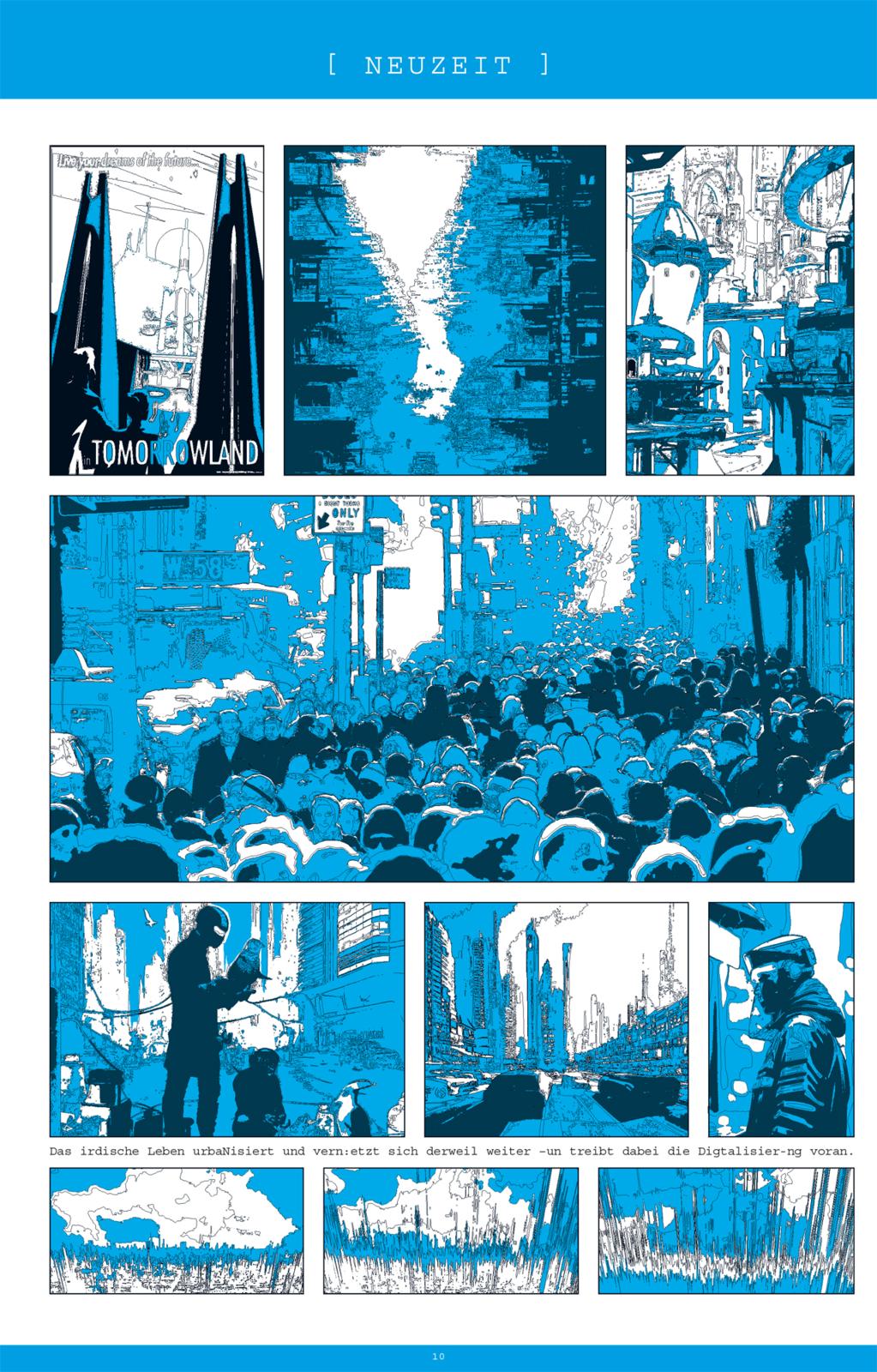 Nachdem Jens Harder in den ersten drei Bänden seiner Serie aufgezeigt hat, welche Bilder und Vorstellungen sich die Menschen von der Entwicklung des Universums und ihrer eigenen Geschichte darin gemacht haben, widmet er sich nun der Zukunft. Wie wird es auf unserem Planeten weitergehen? Welche Zukunft haben wir angesichts eines dramatischen Klimawandels und eines beginnenden Massenaussterbens? Welche Rolle wird Technologie für unser Überleben spielen?