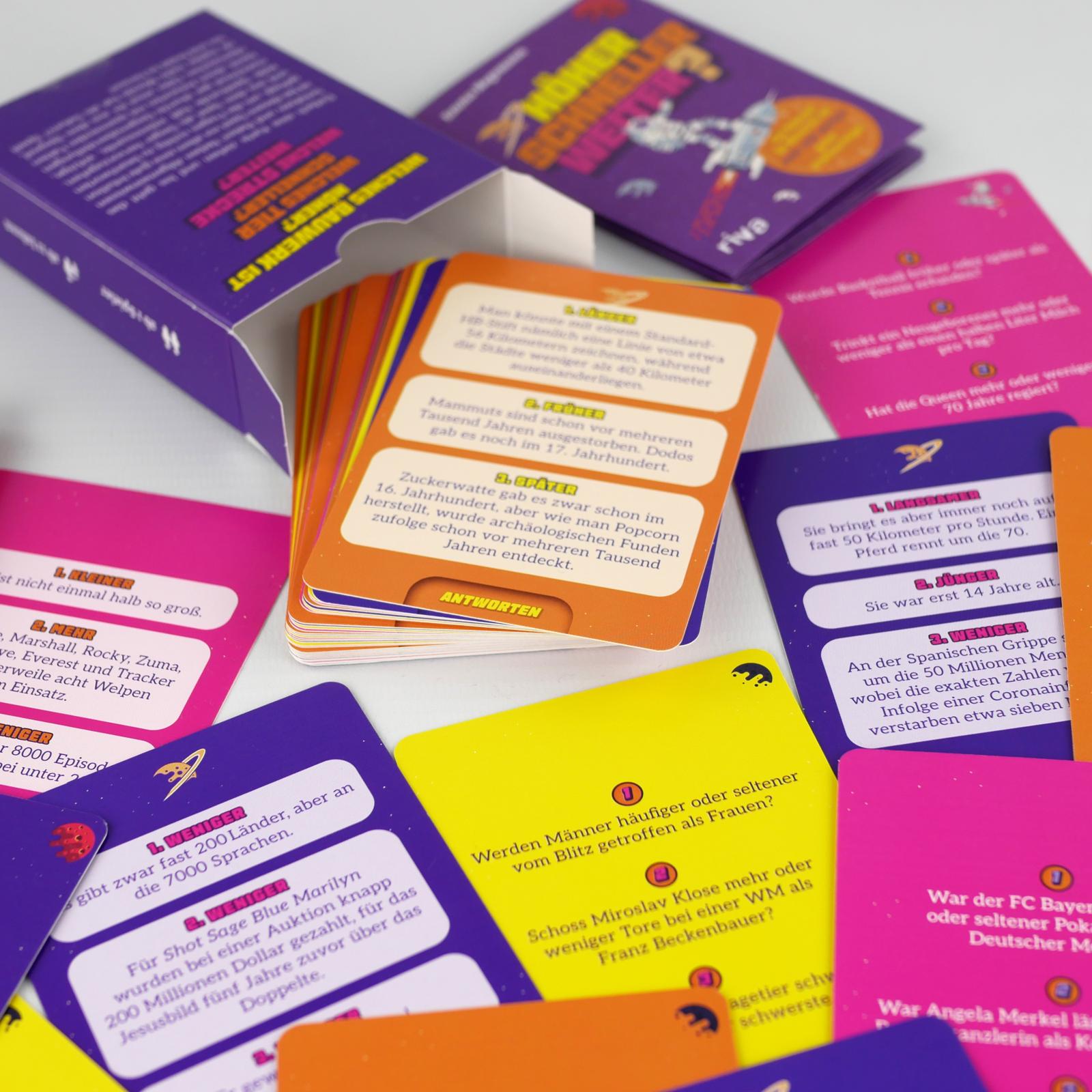 Wer hat mehr Halswirbel - die Giraffe oder der Plesiosaurus? Und hat Taylor Swift mehr Geld als Bill Gates? Könnt ihr erraten, welche Antwortmöglichkeiten der Wahrheit entsprechen? Testet euer Allgemeinwissen und trainiert euer kritisches Denken, während ihr die kreativen, lustigen und manchmal skurrilen Gegenüberstellungen beantwortet. Auch wenn ihr kein Experte in dem Gebiet seid, könnt ihr mit Glück und gutem Einschätzungsvermögen dennoch gewinnen und sogar neue Fakten dazulernen. Oder wisst ihr schon, ob man auf dem Pluto oder dem Mond höher springen kann? »Höher, Schneller, Weiter« ist ideal für Ausflüge, Geburtstage und lustige Spieleabende. Dabei könnt ihr alleine, mit euren Freunden oder der ganzen Familie spielen. Viel Spaß beim Raten!