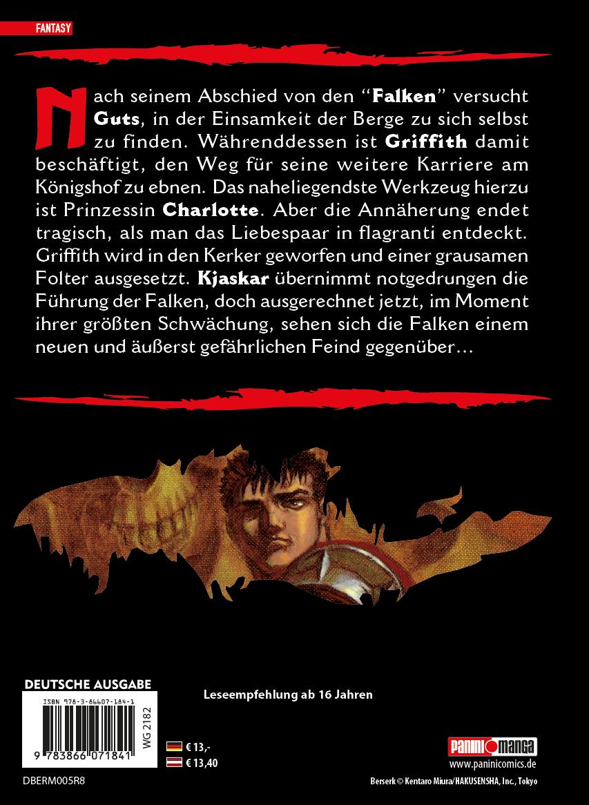 BERSERK MAX 5Nach seinem Abschied von den "Falken" versucht Guts in der Einsamkeit der Berge zu sich selbst zu finden. Währenddessen ist Griffith damit beschäftigt, den Weg für seine weitere Karriere am Königshof zu ebnen. Das naheliegendste Werkzeug hierzu ist Prinzessin Charlotte. Aber die Annäherung endet tragisch, als man das Liebespaar in flagranti entdeckt. Griffith wird in den Kerker geworfen und einer grausamen Folter ausgesetzt. Kjaskar übernimmt notgedrungen die Führung der Falken, doch ausgerechnet jetzt, im Moment ihrer gröbetaten Schwächung, sehen die Falken sich einem neuen und äubetaerst gefährlichen Feind gegenüber.2 Manga in einem Band!