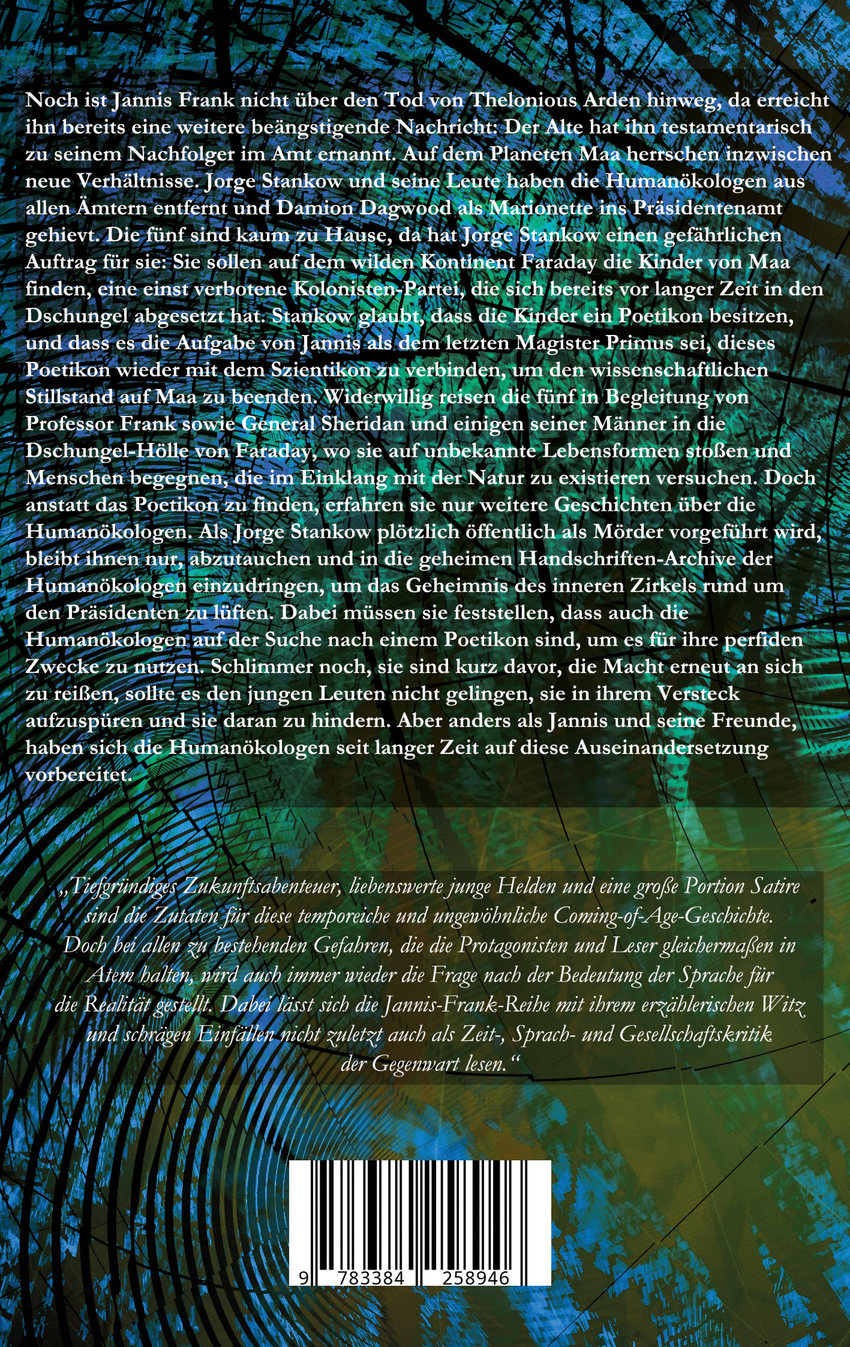 Noch ist Jannis Frank nicht über den Tod von Thelonious Arden hinweg, da erreicht ihn eine weitere beängstigende Nachricht: Der Alte hat ihn testamentarisch zu seinem Nachfolger im Amt ernannt. Auf dem Planeten Maa herrschen inzwischen neue Verhältnisse. Jorge Stankow und seine Leute haben die Humanökologen aus allen Ämtern entfernt und Damion Dagwood als Marionette ins Präsidentenamt gehievt. Jannis und seine Freunde sind kaum zu Hause, da hat Jorge Stankow einen gefährlichen Auftrag für sie: Sie sollen auf dem wilden Kontinent Faraday die Kinder von Maa finden, eine einst verbotene Kolonisten-Partei, die sich vor langer Zeit in den Dschungel abgesetzt hat. Stankow glaubt, dass die Kinder ein Poetikon besitzen, und dass es die Aufgabe von Jannis als dem letzten Magister Primus sei, dieses Poetikon wieder mit dem Szientikon zu verbinden, um den wissenschaftlichen Stillstand auf Maa zu beenden. Widerwillig reisen die fünf in Begleitung von Professor Frank sowie General Sheridan und einigen seiner Männer in die Dschungel-Hölle von Faraday, wo sie auf unbekannte Lebensformen stoßen und Menschen begegnen, die im Einklang mit der Natur zu existieren versuchen. Doch anstatt das Poetikon zu finden, erfahren sie nur weitere Geschichten über die Humanökologen. Als Jorge Stankow plötzlich öffentlich als Mörder vorgeführt wird, bleibt ihnen nur, abzutauchen und in die geheimen Handschriften-Archive der Humanökologen einzudringen, um das Geheimnis des inneren Zirkels rund um den Präsidenten zu lüften. Dabei müssen sie feststellen, dass auch die Humanökologen auf der Suche nach einem Poetikon sind, um es für ihre perfiden Zwecke zu nutzen. Schlimmer noch, sie sind kurz davor, die Macht erneut an sich zu reißen, sollte es den jungen Leuten nicht gelingen, sie in ihrem Versteck aufzuspüren und sie daran zu hindern. Aber anders als Jannis und seine Freunde, haben sich die Humanökologen seit langer Zeit auf diese Auseinandersetzung vorbereitet."Tiefgründiges Zukunftsabenteuer, liebenswerte junge Helden und eine große Portion Satire sind die Zutaten für diese temporeiche und ungewöhnliche Coming-of-Age-Geschichte. Doch bei allen zu bestehenden Gefahren, die die Protagonisten und Leser gleichermaßen in Atem halten, wird auch immer wieder die Frage nach der Bedeutung der Sprache für die Realität gestellt. Dabei lässt sich die Jannis-Frank-Reihe mit ihrem erzählerischen Witz und schrägen Einfällen nicht zuletzt als Zeit-, Sprach- und Gesellschaftskritik der Gegenwart lesen."