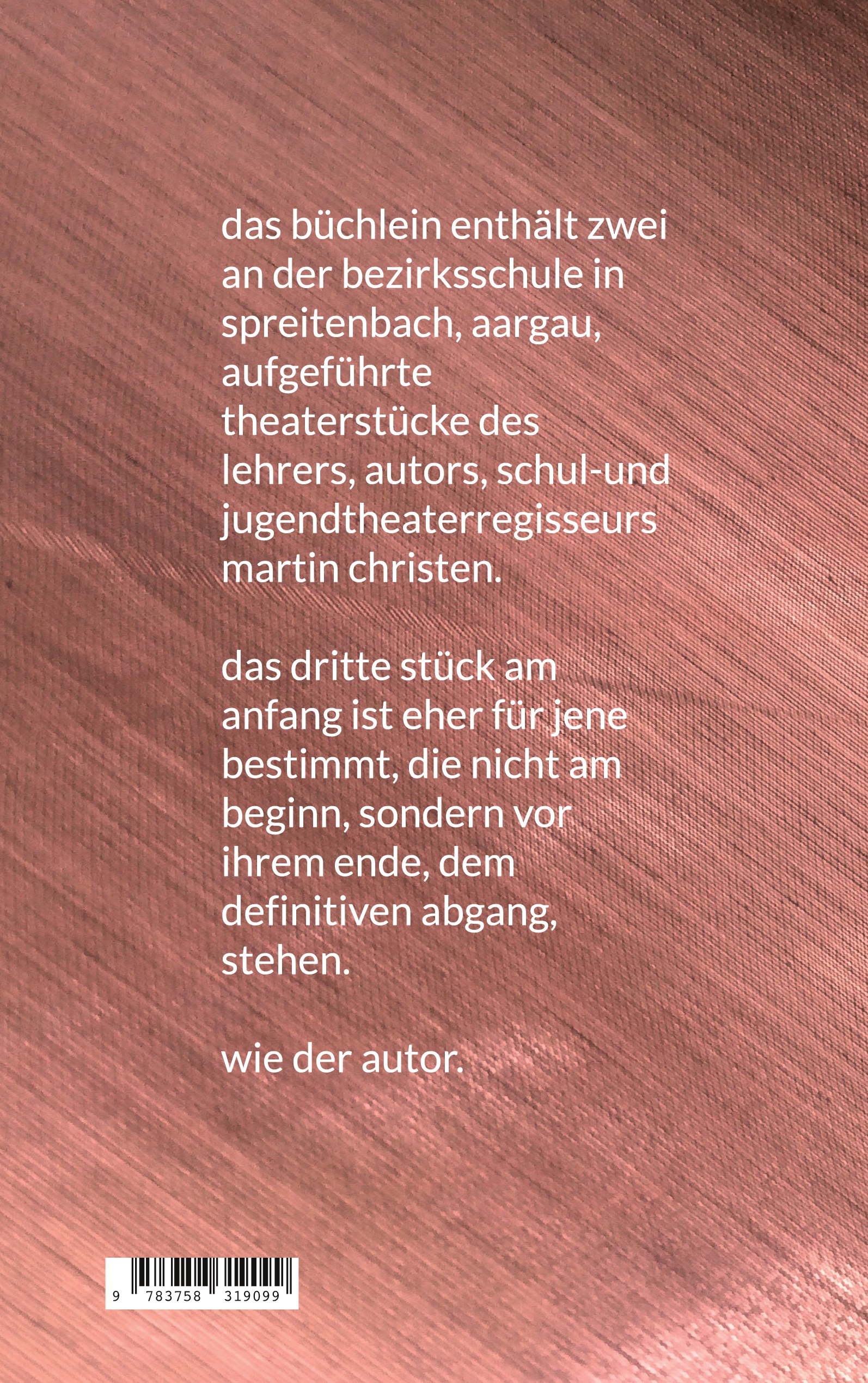 An der Oberstufe in der Deutschschweiz (Bezirksschule in Spreitenbach, Aargau) aufgeführte Theaterstücke des Autors und Schul- und Jugendtheaterregisseurs Martin Christen.