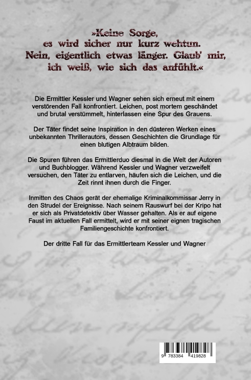 | Schlagworte | Buchblogger und Autoren • Düstere Thrillerwelt • Ermittler-Duo Kessler und Wagner • Literatur als Mordvorlage • Privatdetektiv mit Tragik • psychologische Abgründe • Spannung und Nervenkitzel • unvorhersehbare Wendungen • Verstörende Mordserie • Wettlauf gegen die Zeit |