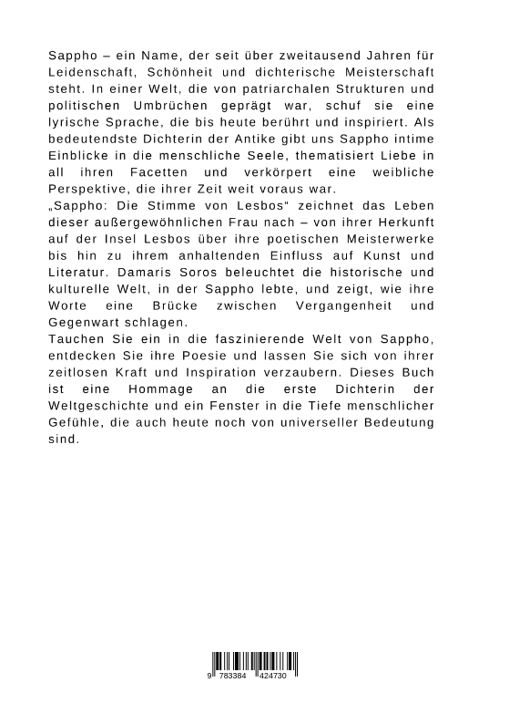 Sappho - ein Name, der seit über zweitausend Jahren für Leidenschaft, Schönheit und dichterische Meisterschaft steht. In einer Welt, die von patriarchalen Strukturen und politischen Umbrüchen geprägt war, schuf sie eine lyrische Sprache, die bis heute berührt und inspiriert. Als bedeutendste Dichterin der Antike gibt uns Sappho intime Einblicke in die menschliche Seele, thematisiert Liebe in all ihren Facetten und verkörpert eine weibliche Perspektive, die ihrer Zeit weit voraus war."Sappho: Die Stimme von Lesbos" zeichnet das Leben dieser außergewöhnlichen Frau nach - von ihrer Herkunft auf der Insel Lesbos über ihre poetischen Meisterwerke bis hin zu ihrem anhaltenden Einfluss auf Kunst und Literatur. Damaris Soros beleuchtet die historische und kulturelle Welt, in der Sappho lebte, und zeigt, wie ihre Worte eine Brücke zwischen Vergangenheit und Gegenwart schlagen.Tauchen Sie ein in die faszinierende Welt von Sappho, entdecken Sie ihre Poesie und lassen Sie sich von ihrer zeitlosen Kraft und Inspiration verzaubern. Dieses Buch ist eine Hommage an die erste Dichterin der Weltgeschichte und ein Fenster in die Tiefe menschlicher Gefühle, die auch heute noch von universeller Bedeutung sind.